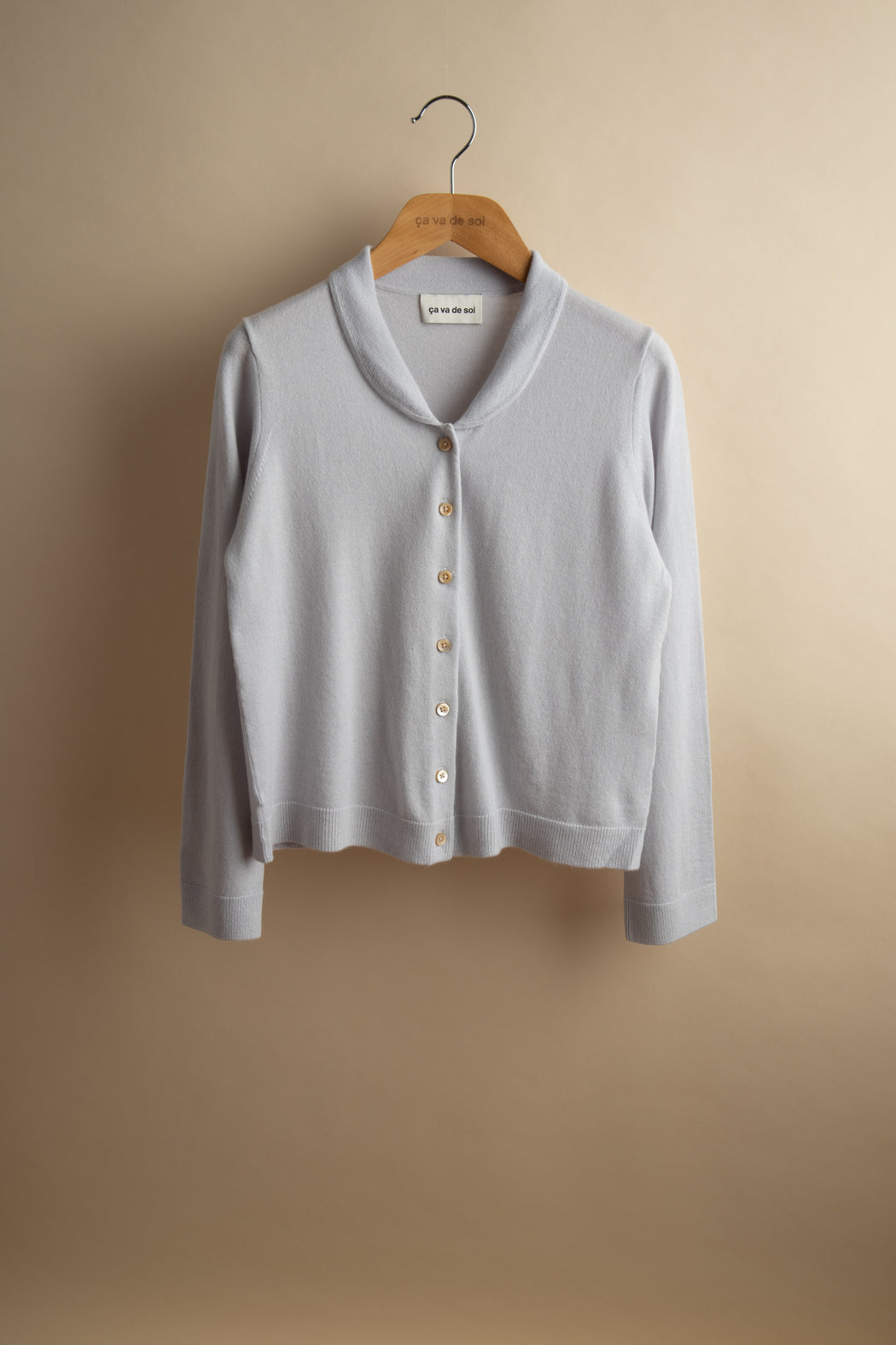 Le col Claudine confère à ce cardigan, une coquetterie d’une rare élégance. Né au début du XXe siècle, inspiré du costume de l’héroïne Claudine de Colette, il s’est imposé comme une signature de la féminité délicate et des lignes épurées.