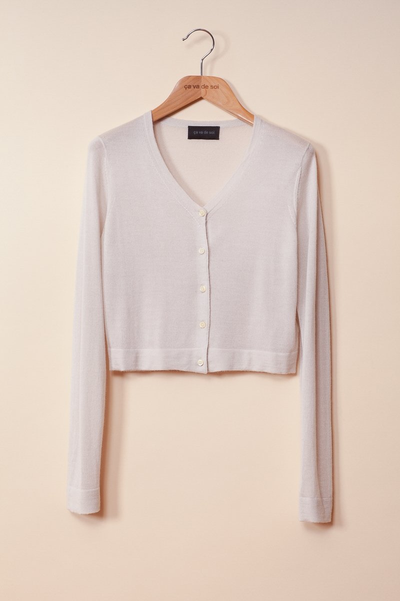 Ce cardigan court douceur est fait d’un fin cachemire 15-microns (70%) et de soie de Mulberry (30%), le duo parfait ! La recette, ce sont les maîtres filateurs en Italie qui la détiennent. Les rois de la laine et du cachemire! La recette, ce sont les maîtres filateurs en Italie qui la détiennent: les rois de la laine et du cachemire... Cet assemblage de ces deux matières nobles affiche une esthétique parfaite. La douceur du cachemire, et la brillance et fraîcheur de la soie feront de votre cardigan un ami intime, en toute occasion.
