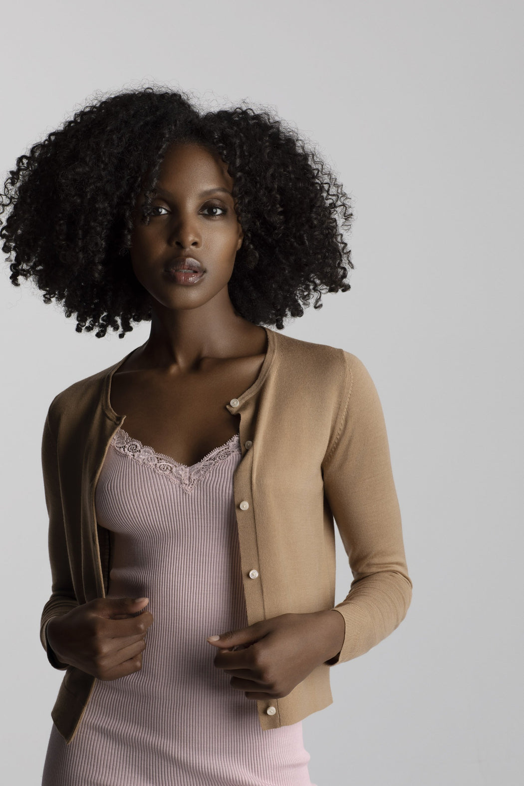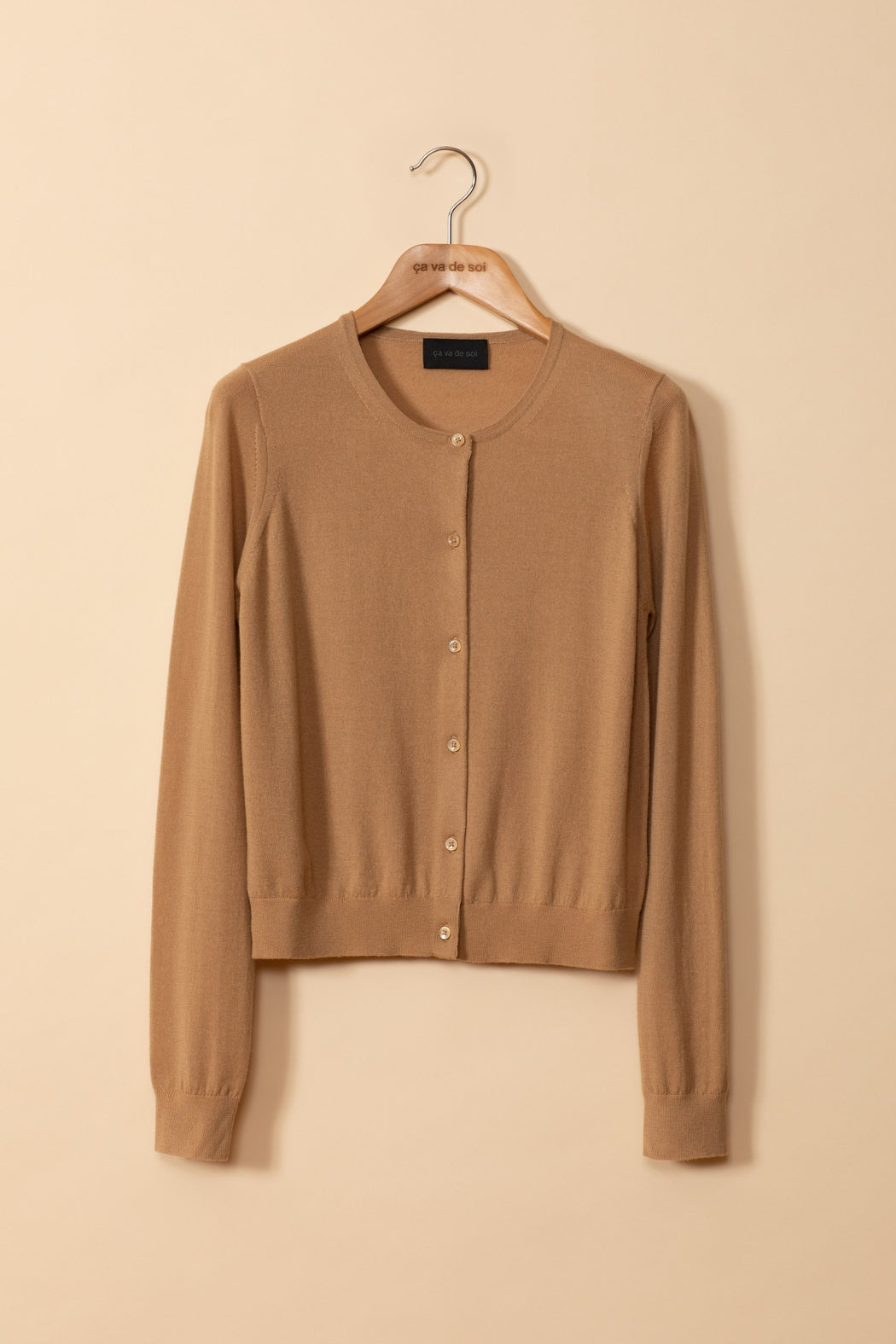 Ce cardigan ras-du-cou est un de nos fétiches chez ça va de soi pour sa multi fonctionnalité, un trois dans un: en attachant tous les boutons il se transforme en pull ras du cou, en détachant les 2 ou 3 boutons du haut , on obtient un tunisien, sans oublier sa fonction première de twin-set avec une robe ou son pull. Sa versatilité vous épate-ra. Nous avons modernisé cet icône en le raccourcissant légèrement et en faisant le bas plus droit. Simone vous suivra partout, dans tout vos voyages. Fait de mérinos australien peigné Super 140 (ELS-soies extra-longues), il est durable et facile d’entretien. La finesse de son micron (16.5) vous permet de le porter directement sur la peau ou de servir de première couche à superposer en temps plus froids. Nous avons produit ce tricot en 4 couleurs moulinées (teinture par écheveaux par des maîtres en Italie): neige, noir, crevette, camel.