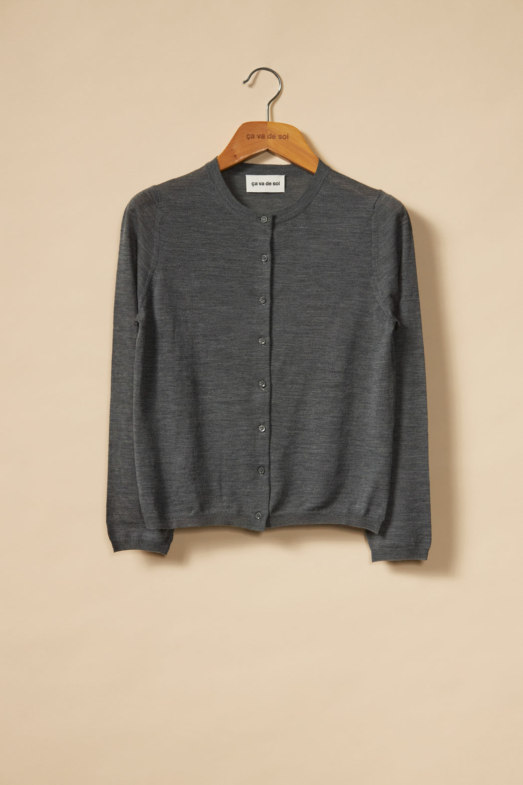 Ce cardigan ultra-fin est fait de laine mérinos Super 140 aux soies extra-longues de micron 16.5 qui lui permet de s'adapter aux fluctuations de température de l'environnement et du corps. Intemporel et thermique, il se porte directement sur la peau pour une sensation de légèreté et douceur créant un bien-être ultime. Multifonctionnel, c'est un trois en un: en attachant tous ses boutons, il se transforme en pull ras-du-cou; en détachant les 2-3 boutons du haut, on obtient un tunisien, sans oublier sa fonction première de twin-set sur un pull ou sur une robe. Pauline vous suivra partout.