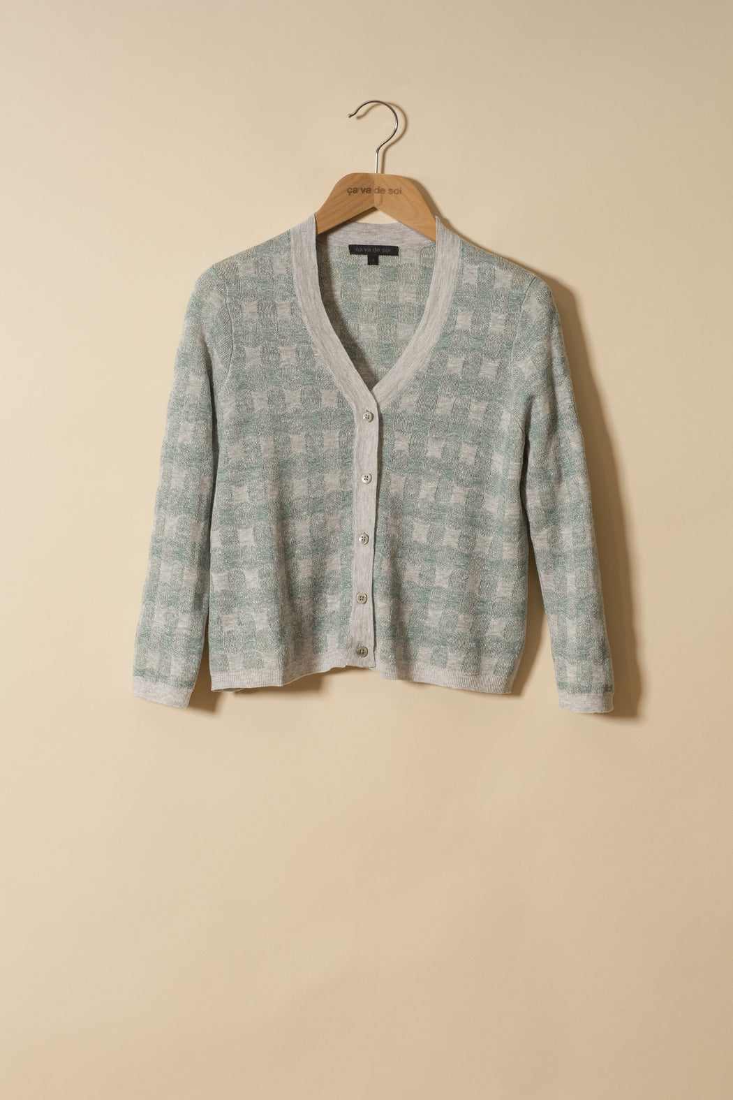 Ce cardigan jacquard est fait de notre coton signature, le mako d’Égypte, et d’un fin fil de lin africain brut. Cette matière plein été, qu’on aime appeler le 'duo estival', permet d’apprivoiser en confort et élégance les grandes chaleurs humides. L’amalgame affiche naturellement une allure vintage et est à la base de pièces uniques idéales en saisons de chaleur. Le lin détient une capacité d’absorption d’humidité inégalée.