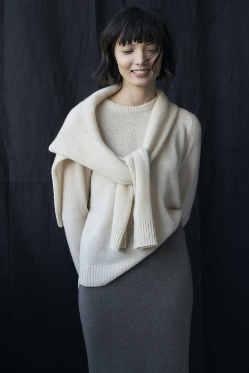 Oser brosser du cachemire de cette qualité, c’est audacieux et judicieux; sachant que le brossage est une technique qui s’applique en général sur des fils moins précieux. De ce savoir-faire unique en résulte une matière d’exception de mousse de cachemire poilue, douillette et aérienne qui nous reconnecte aux années ‘70.