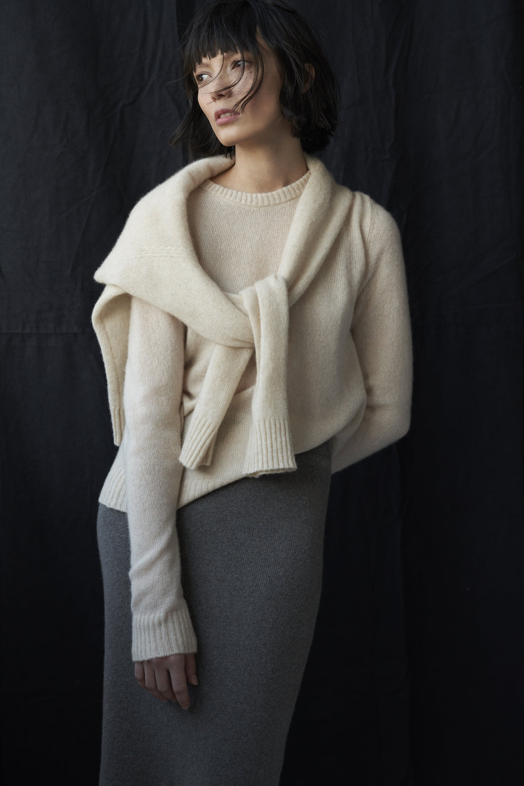 Oser brosser du cachemire de cette qualité, c'est audacieux et judicieux; sachant que le brossage est une technique qui s’applique en général sur des fils moins précieux… De ce savoir-faire unique en résulte une matière d’exception de mousse de cachemire poilue, douillette et aérienne qui nous reconnecte aux années 70. L’ajout de 37% de coton rehausse ses propriétés thermiques, permettant ainsi de le porter toute l'année, autant à l’intérieur qu'à l’extérieur.