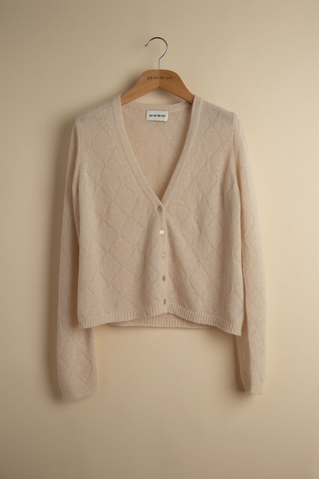 Délicate dans sa forme, un cardigan plein de finesse et de raffinement, ajouré pour un jeu de transparence féminin et moderne dans un motif simple qui lui donne du relief.