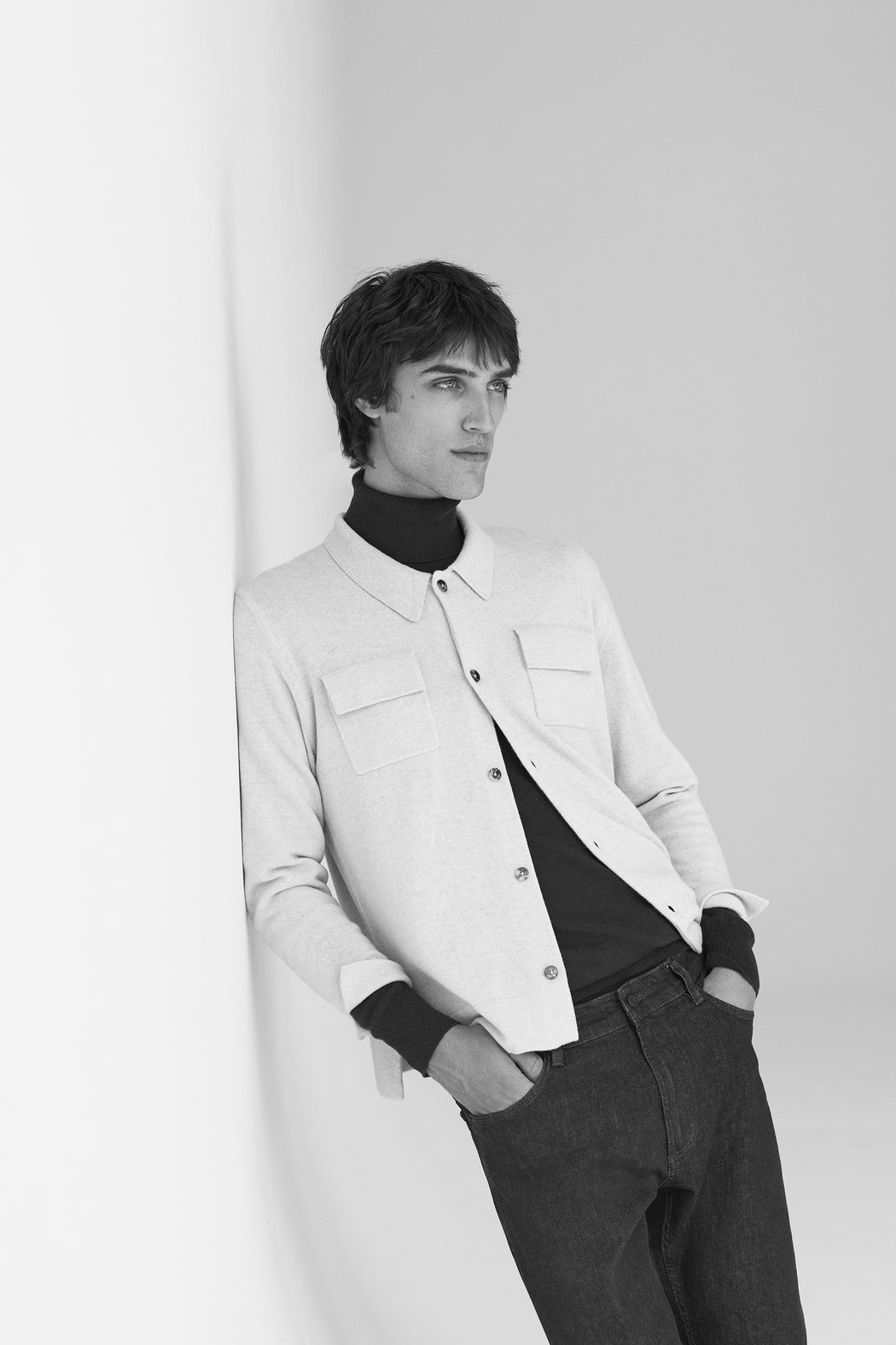 Tricoté en laine de mérinos cardée, filée expressément en Italie pour ça va de soi, dont la fibre extrafine (micron 15.5) et ultra longue (gage de longévité et beauté) donne l'impression de porter un nuage douillet — une matière émotionnelle et intelligente qui comprend le langage du corps.