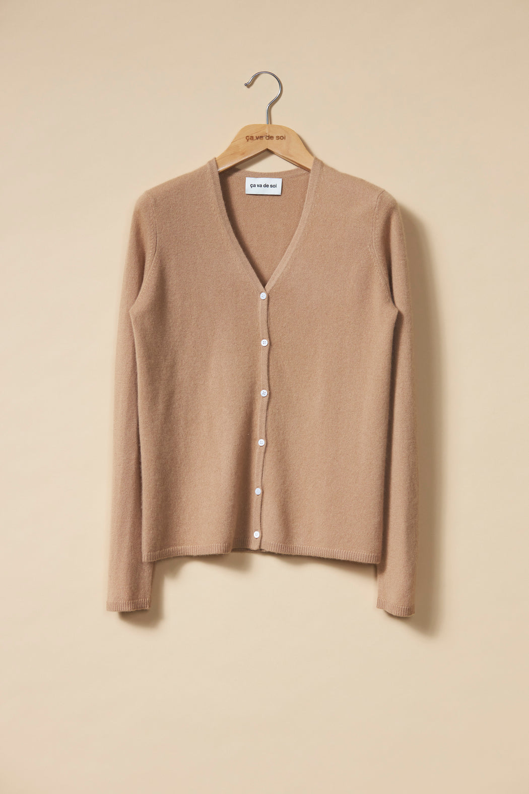 Il suffit de le toucher avec les yeux… Ce cardigan décontracté à encolure V est fait de duvet de cachemire de micron 13 provenant d’une petite production exclusive en Mongolie. Son tricotage desserré en jauge 12 lui confère un effet duveteux et classique. D’une élégance et d’un luxe purs! ça va de soi joue ce cachemire avec une fantaisie aérienne pour habiller la peau d’une douceur unique avec chaleur. Nous l’avons produit en 2 couleurs essentielles non teintes.