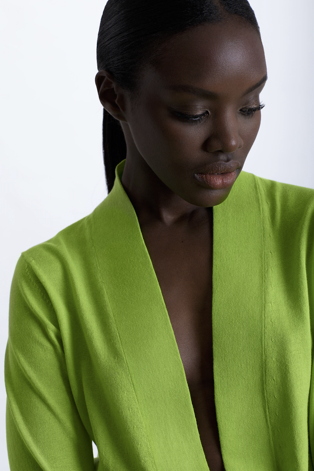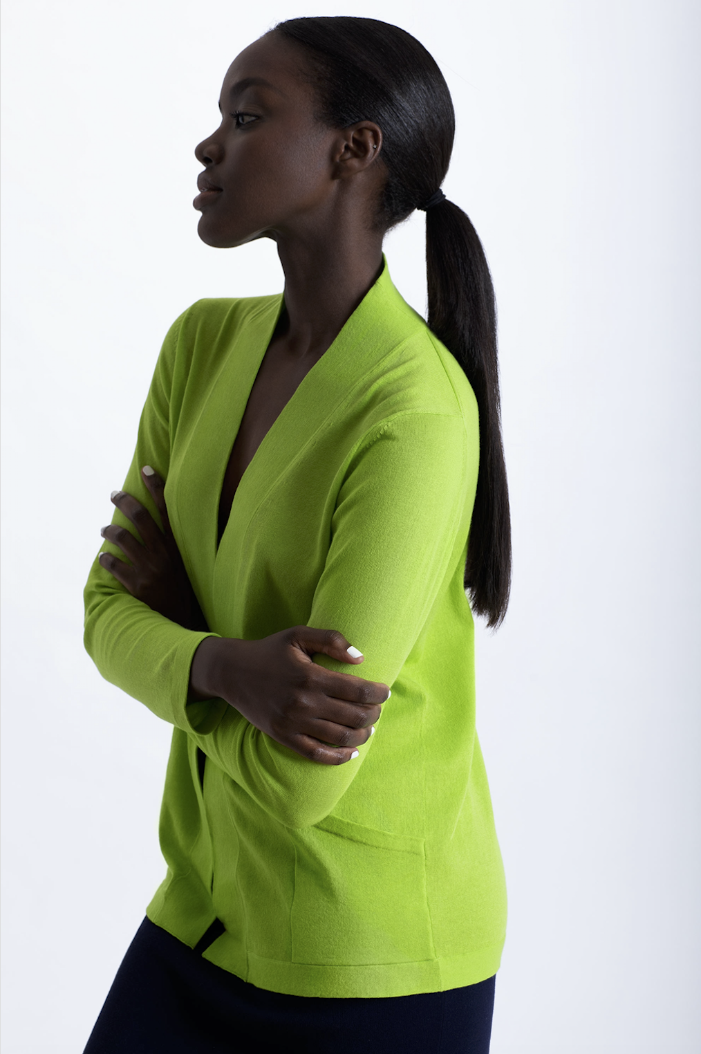 ça va de soi rend utilitaire le cardigan avec ses poches et en enlevant ses boutons pour qu’il s’agence à merveille avec une jupe, un robe, jeans ou un pantalon. Valencia se différencie par sa versatilité. Fait en coton égyptien COM4-ZERO™, fruit de 50 ans de recherche, ce fil italien allie la beauté millénaire des cotons égyptiens et une technologie de filage d’avant-garde, éliminant presque entièrement l’ébouriffement du fil qui, avec le temps, l’amène à boulocher. Peu torsadé, ce fil conserve avantageusement l’élasticité naturelle de la fibre, et sa douceur. Nous avons produit ce tricot en 4 couleurs riches et toniques (teinture par écheveaux par des maîtres en Italie): ananas, pistache, goyave, noir.