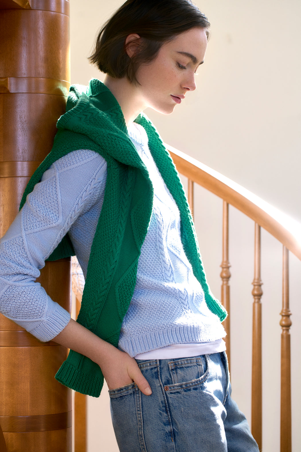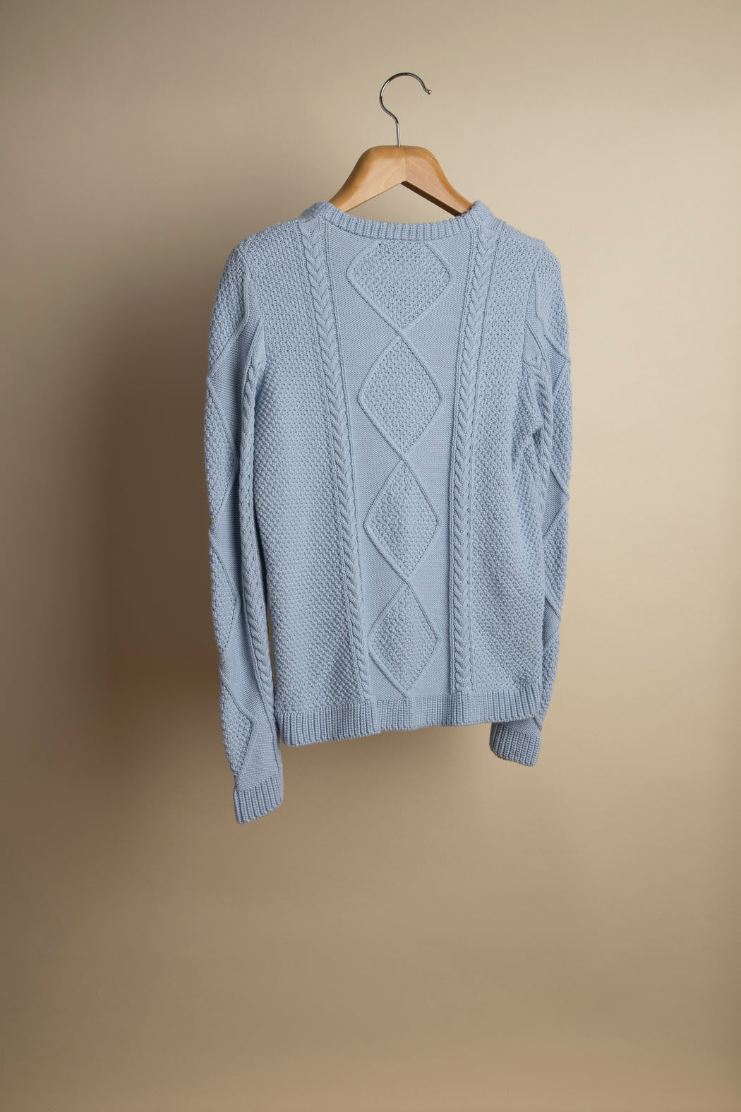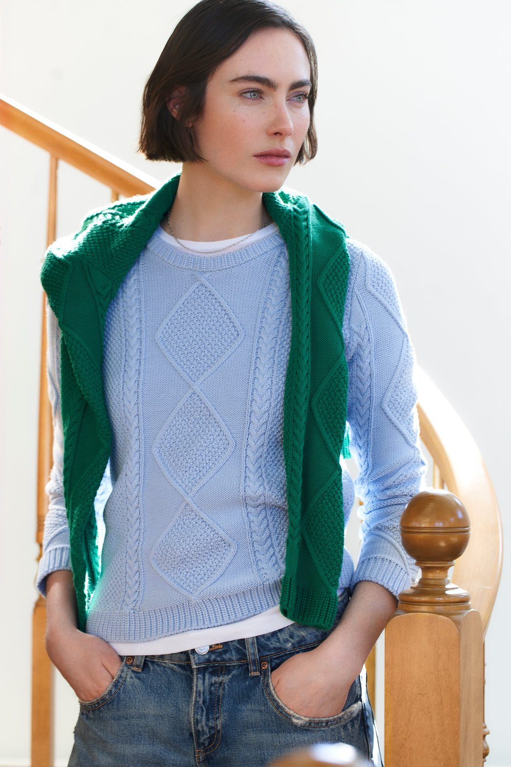 Un grand classique de la garde-robe féminine et masculine, le pull Aran peut prendre entre 40 et 60 heures lorsqu’il est fait à la main. Le nôtre est tricoté avec un fil double gazé de coton égyptien pour une douceur durable et une sensation de confort.