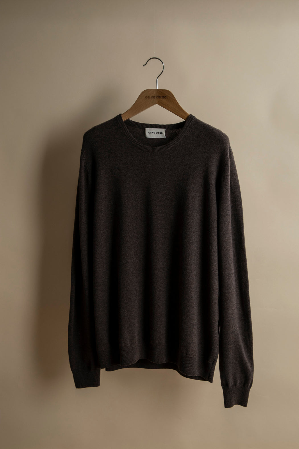 Tricoté en laine de mérinos cardée, filée expressément en Italie pour ça va de soi, dont la fibre extrafine (micron 15.5) et ultra longue (gage de longévité et beauté) donne l'impression de porter un nuage douillet — une matière émotionnelle et intelligente qui comprend le langage du corps.