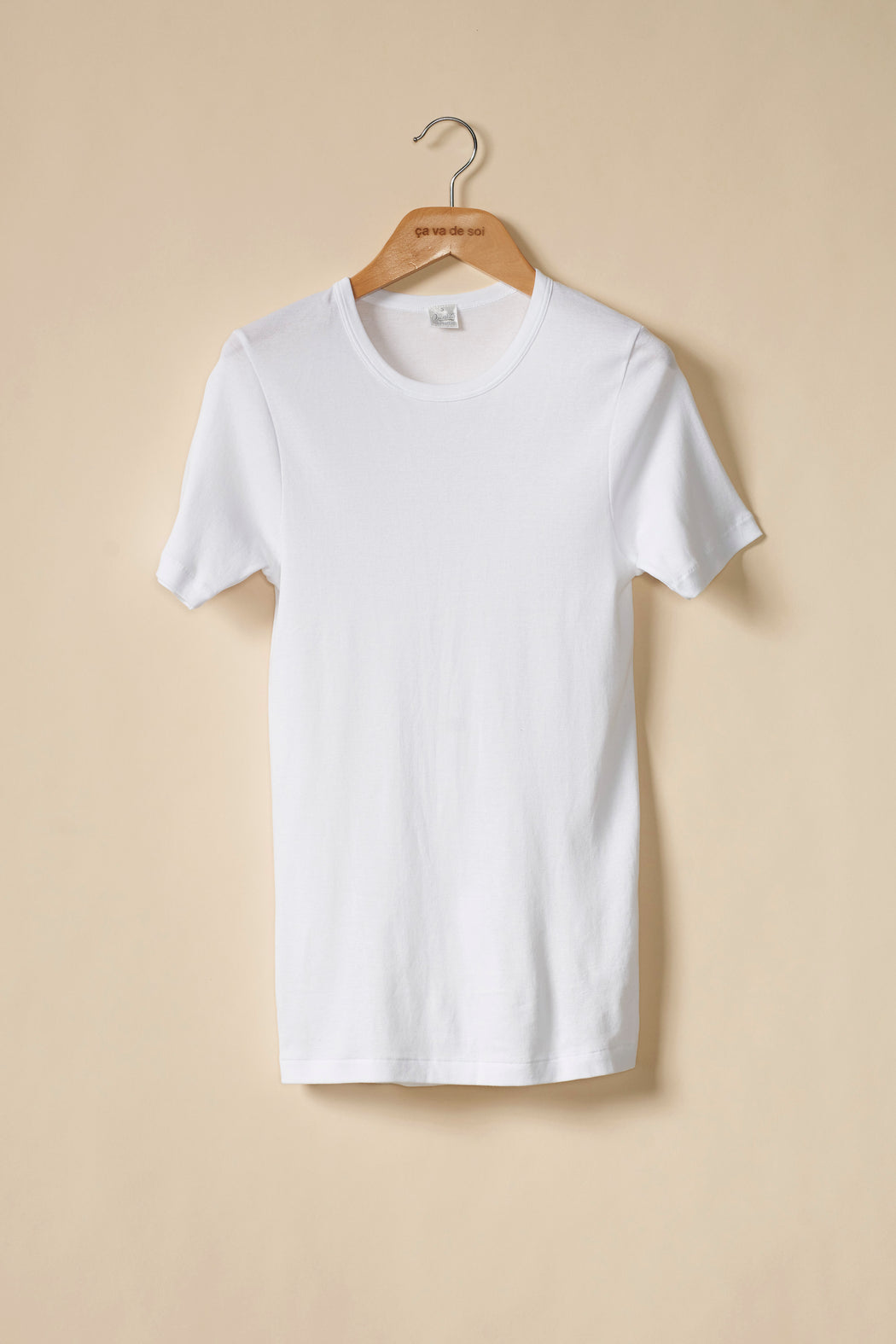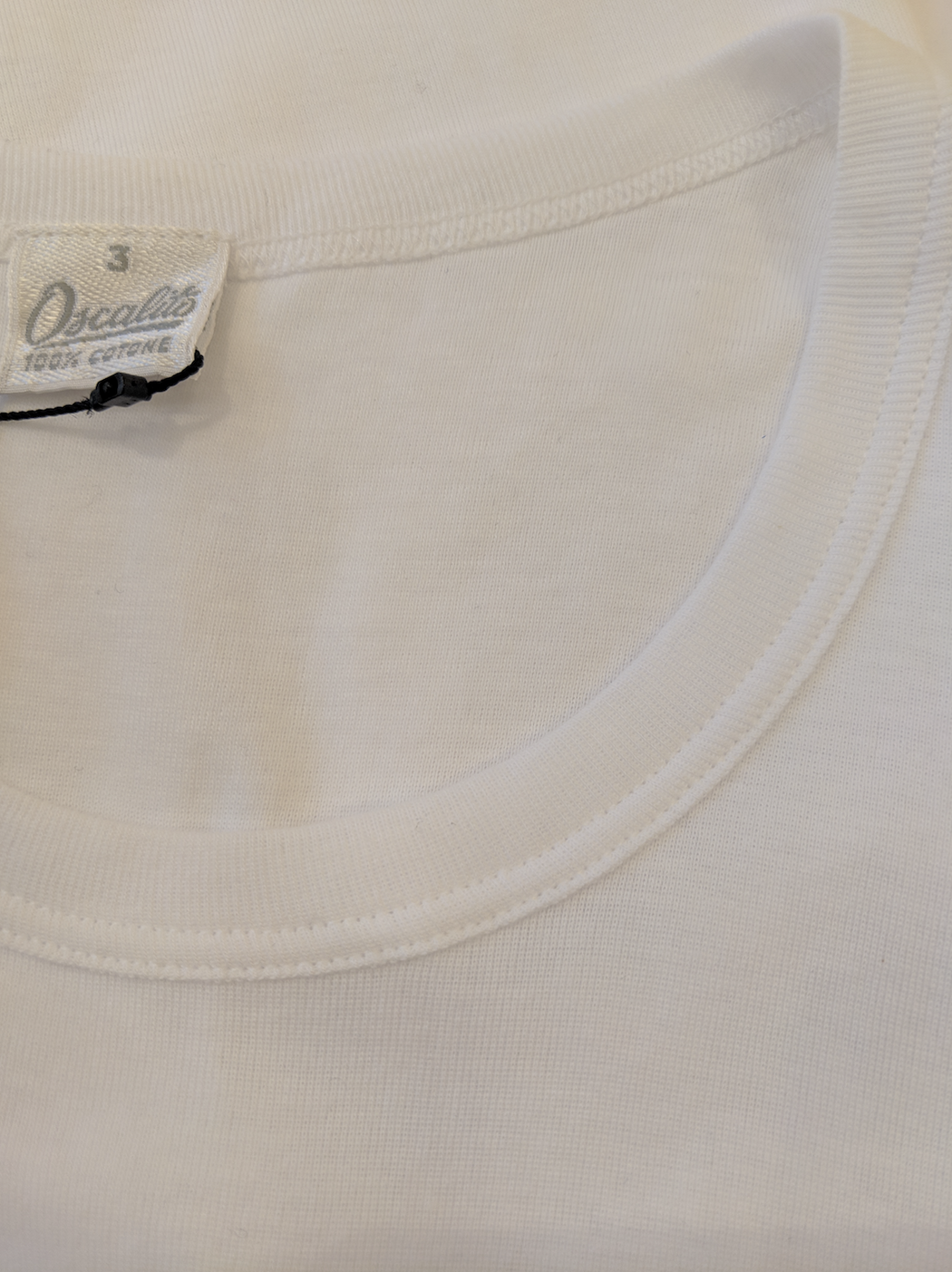 This unisex t-shirt is a pure classic from Oscalito. The historical circular knitting machines used to knit this product operate at lower speeds which results in a unique fabric of pure Egyptian Mako mercerized cotton, that offers long-lasting memory. The mercerized cotton used to make this garment, is also known as Lisle Cotton (Filoscozia®). Filoscozia® calls for softness with a silky texture, and is known for its hypoallergenic properties and a fresh feel on the skin. The Seamless technique offers an incomparable comfort due to the fact that it has no sideseams. ça va de soi chose this second-skin essential for its classic appeal, its durability and refined make. Available in white.