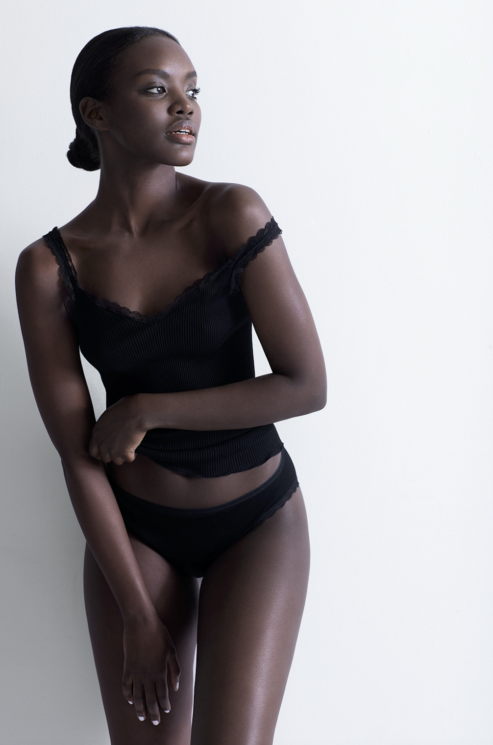 This cami made with fine Lace trims from the famous Calais region in Normandy, is a unique product. The historical circular knitting machines used to knit this product operate at lower speeds which results in a fabric that offers long-lasting memory. The mercerized Egyptian Makp cotton used to make this garment, is also known as Lisle Cotton (Filoscozia®). Filoscozia® calls for softness with a silky texture, and is known for its hypoallergenic properties and a fresh feel on the skin. This underpinning will bring an elegant and feminine appeal to your outfits. ça va de soi chose this second-skin essential for its uniqueness, its durability and refined make. Available in black and white.