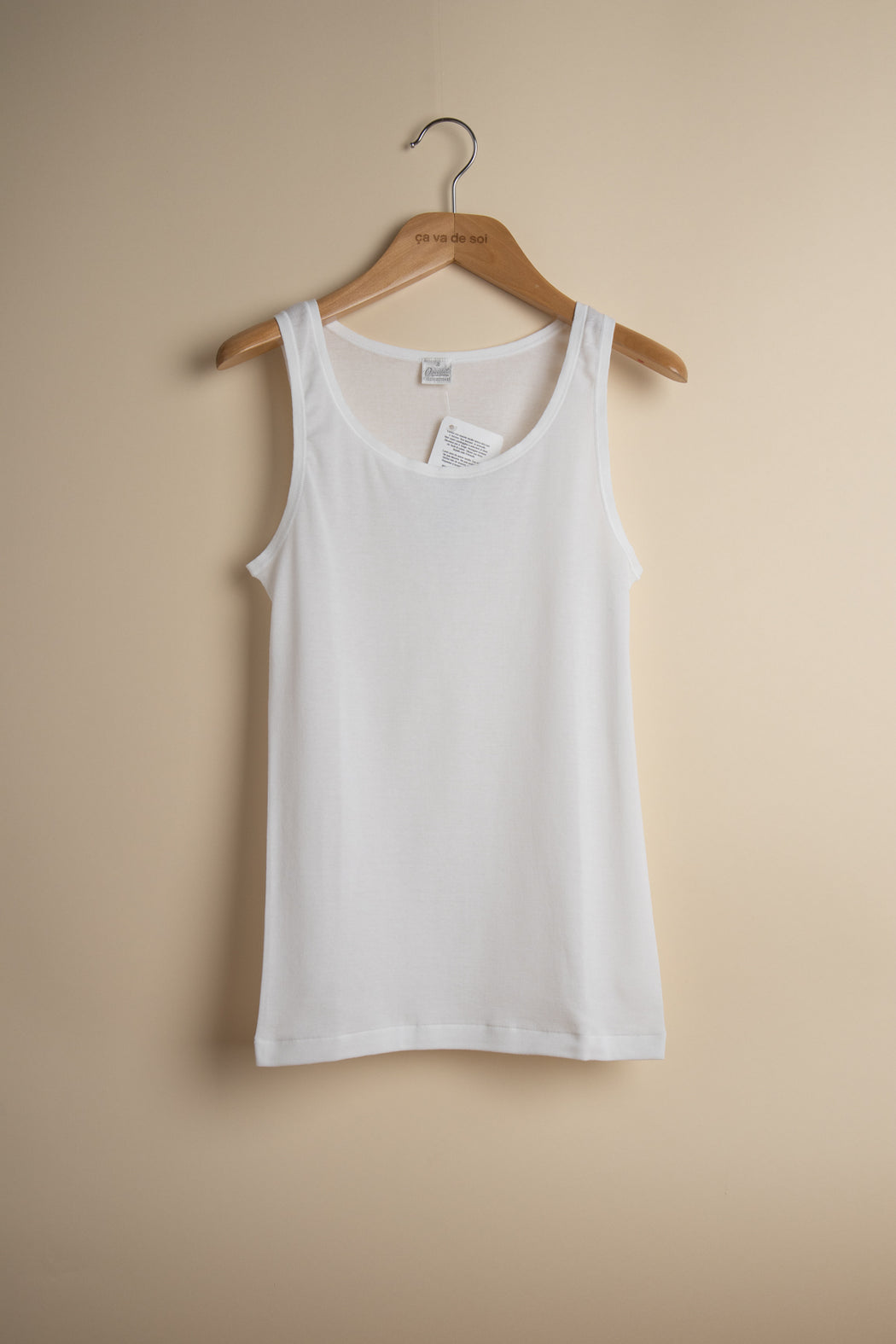 This sleevless top is a great classic from the Oscalito collection, specifically designed in the proportions of ça va de soi. Made with old-fashioned, slow-paced circular machines, it promises a fabric with a long-lasting memory. The material: pure Egyptian Makò cotton. The Seamless technique offers unequaled comfort. ça va de soi chose this essential second skin for its classicism, durability and finesse.