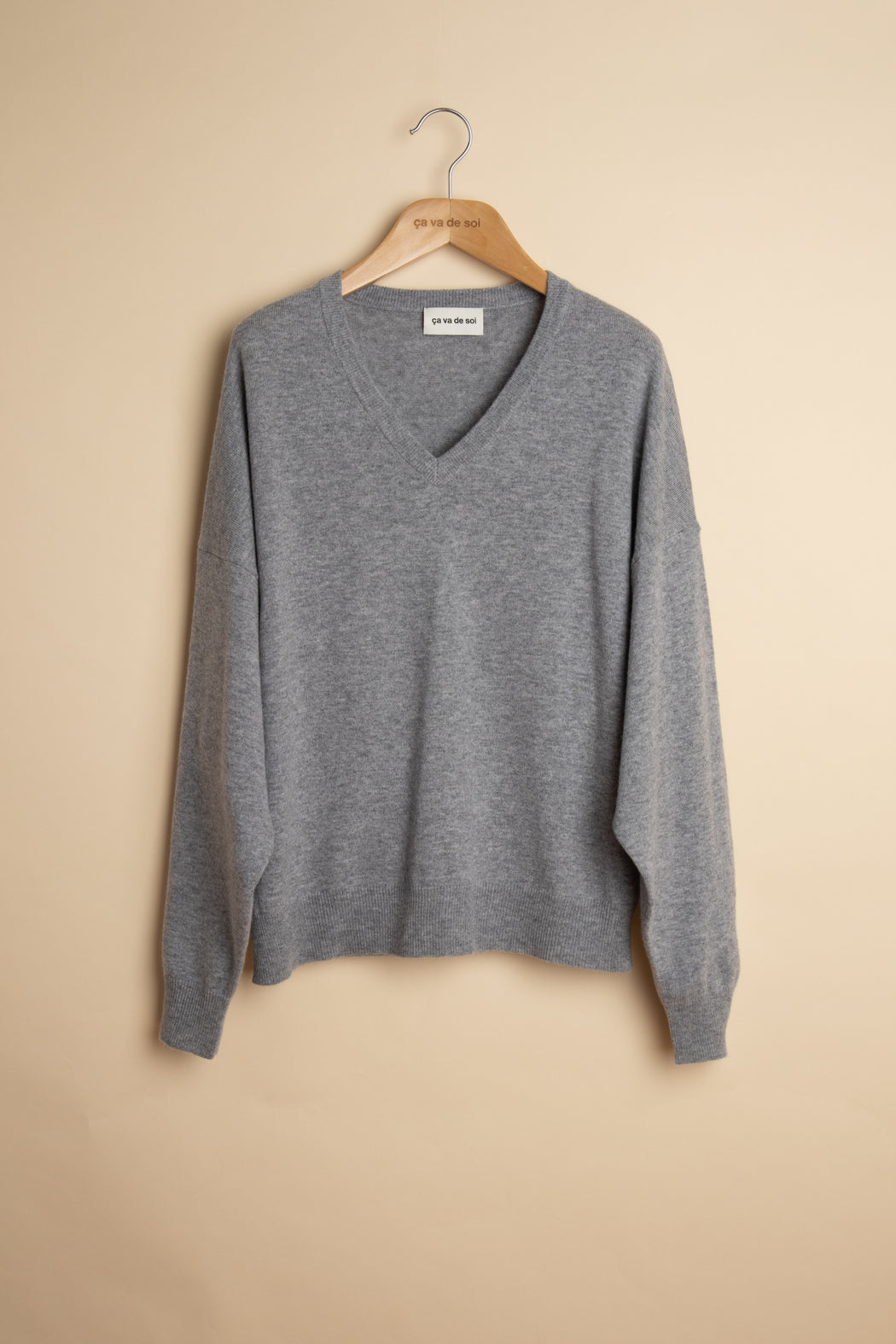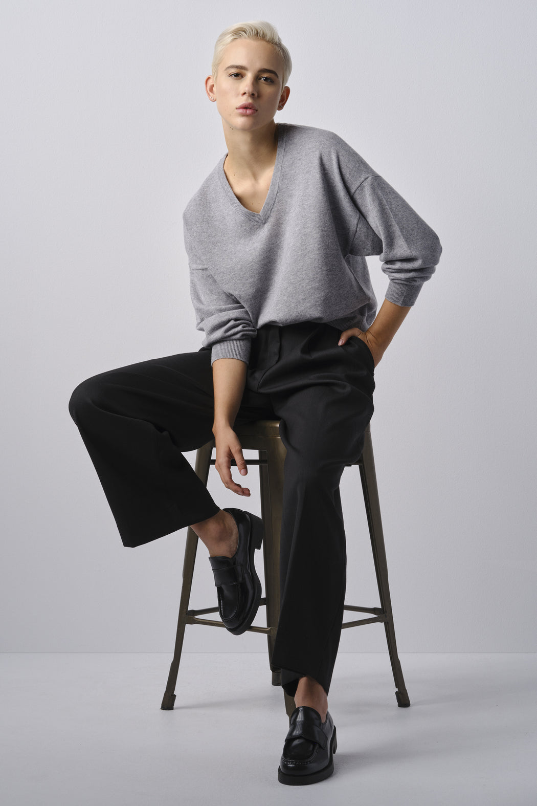This go-anywhere v-neck sweater’s is inspired by the silhouettes of the 40’s and 80’s. It’s straight, square shape, makes it the ideal choice to wear with your favourite pair of jeans but can be just as practical and chic over a dress or skirt.