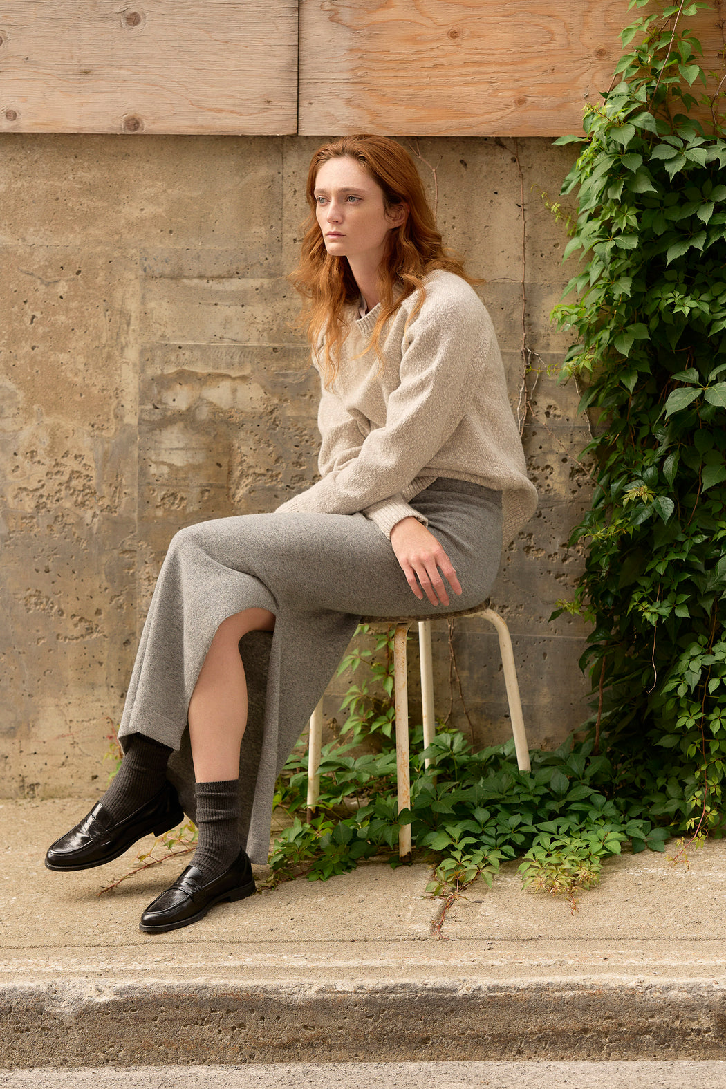 Dallmally is a fitted long skirt offering incomparable comfort thanks to its elastic waistband and practical side slit for ease of movement. Its tubular finish streamlines the silhouette. Wearing Dallmally feels like slipping into ultra-comfy joggers—yet with elegance and refinement.