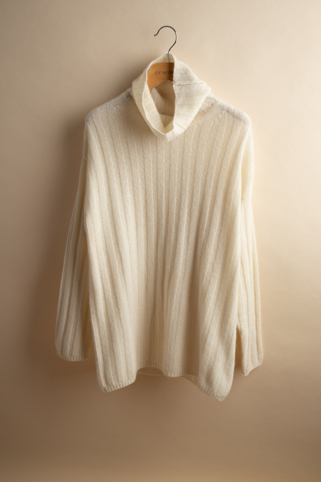 Relaxed yet elegant, Bohai captivates with its slightly draped high neck that provides just the right amount of warmth around the neck. Its flat rib knit accentuates the silhouette with fluidity and modernity. Versatile, it can be worn both in a cozy, relaxed style and with a confident urban look, becoming the perfect tunic to accompany the rhythm of everyday life with softness and character.