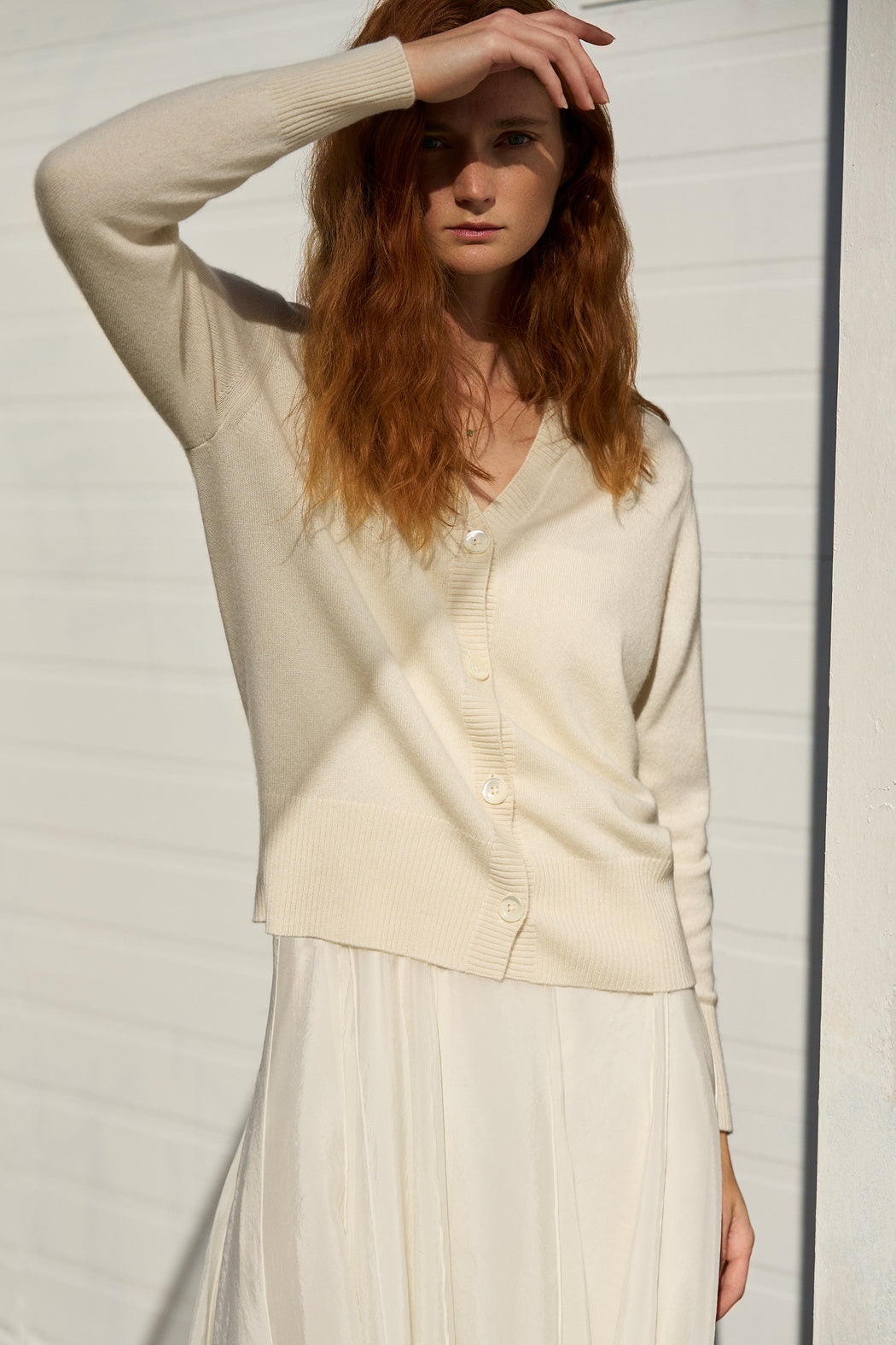 Tricoté en cachemire-soie cardé,  filé en Italie, il allie la chaleur enveloppante du cachemire avec la fraîcheur et l’éclat raffiné de la soie, offrant un toucher inédit et un raffinement poudré. Thermique et isolant, il est chaud en hiver, frais au printemps. Léger et lumineux, il se porte toute l’année comme une deuxième peau aérienne, douce et durable.