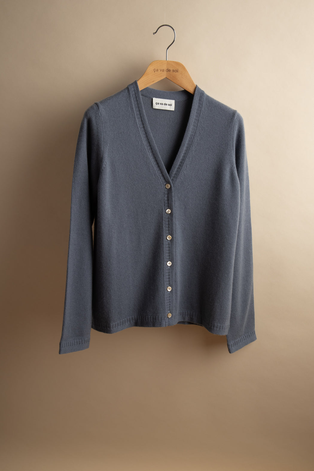 Knitted in a carded cashmere-silk blend (70-30), spun in Italy, it combines the enveloping warmth of cashmere with the freshness and refined sheen of silk, offering a unique feel and a powdery elegance.