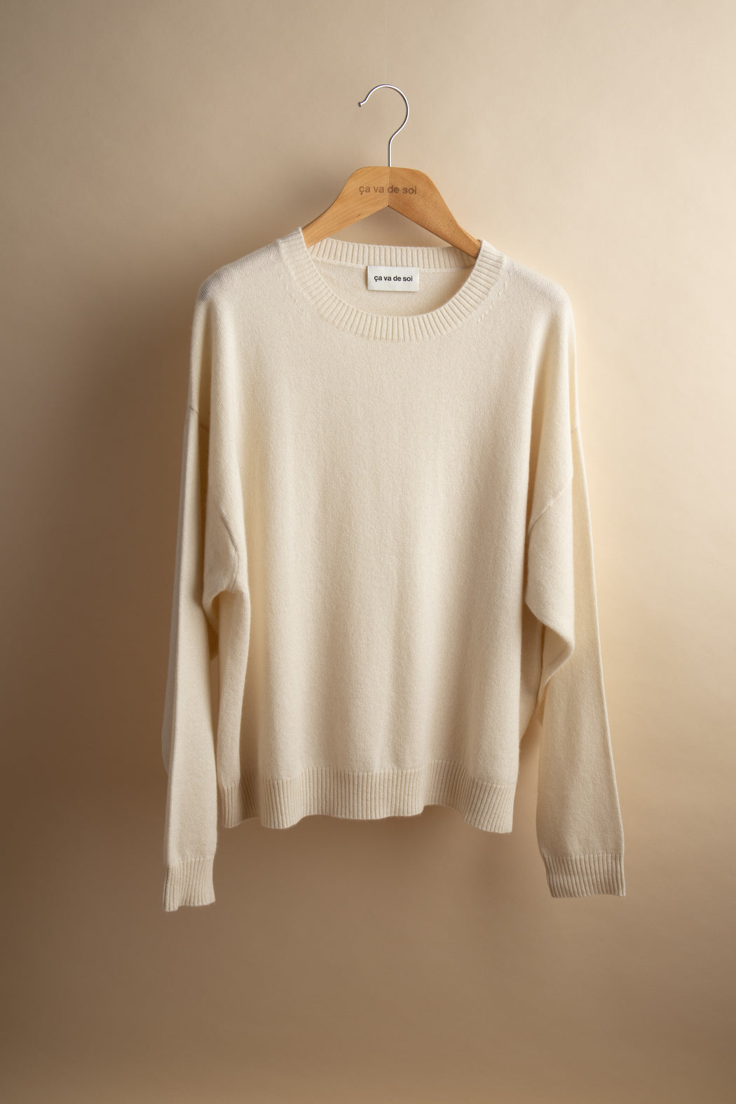 Knitted in a carded cashmere-silk blend (70-30), spun in Italy, it combines the enveloping warmth of cashmere with the freshness and refined sheen of silk, offering a unique feel and a powdery elegance.