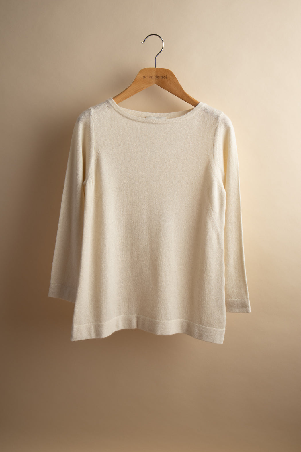 The boat neckline, renowned for being one of the most flattering and feminine, accentuates subtly collarbones while gracefully elongating the neck. Its effect shall slim and brighten any look.