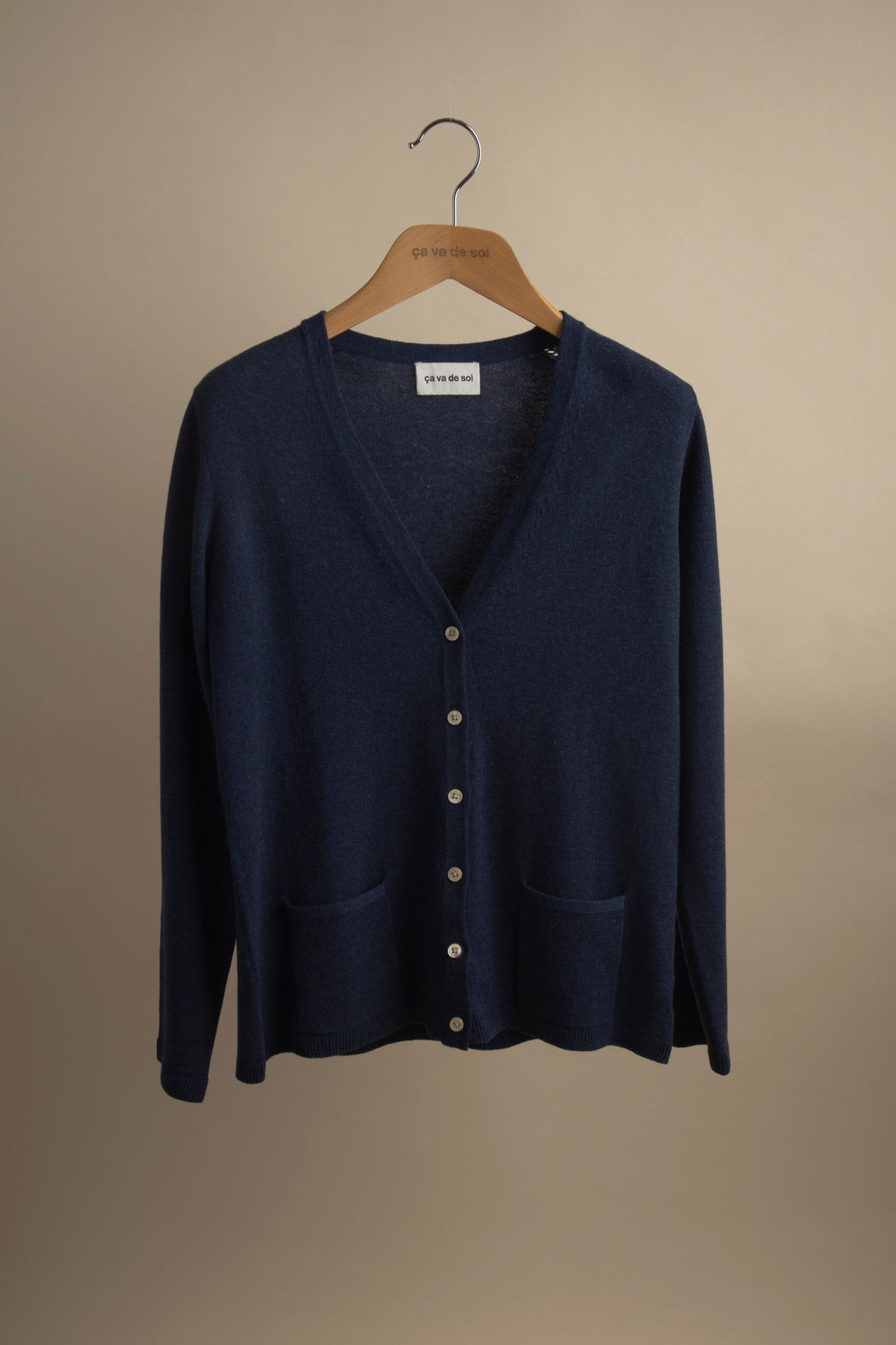 With pure, modern lines, this cardigan has a timeless appeal, elevated with feminine details through its V-neckline and slightly fitted cut. Two patch pockets finished with tubular jersey trim and small mother-of-pearl buttons add refined touches. Pair it with our couture T-shirt AGATHA for an elegant, classic twin-set.