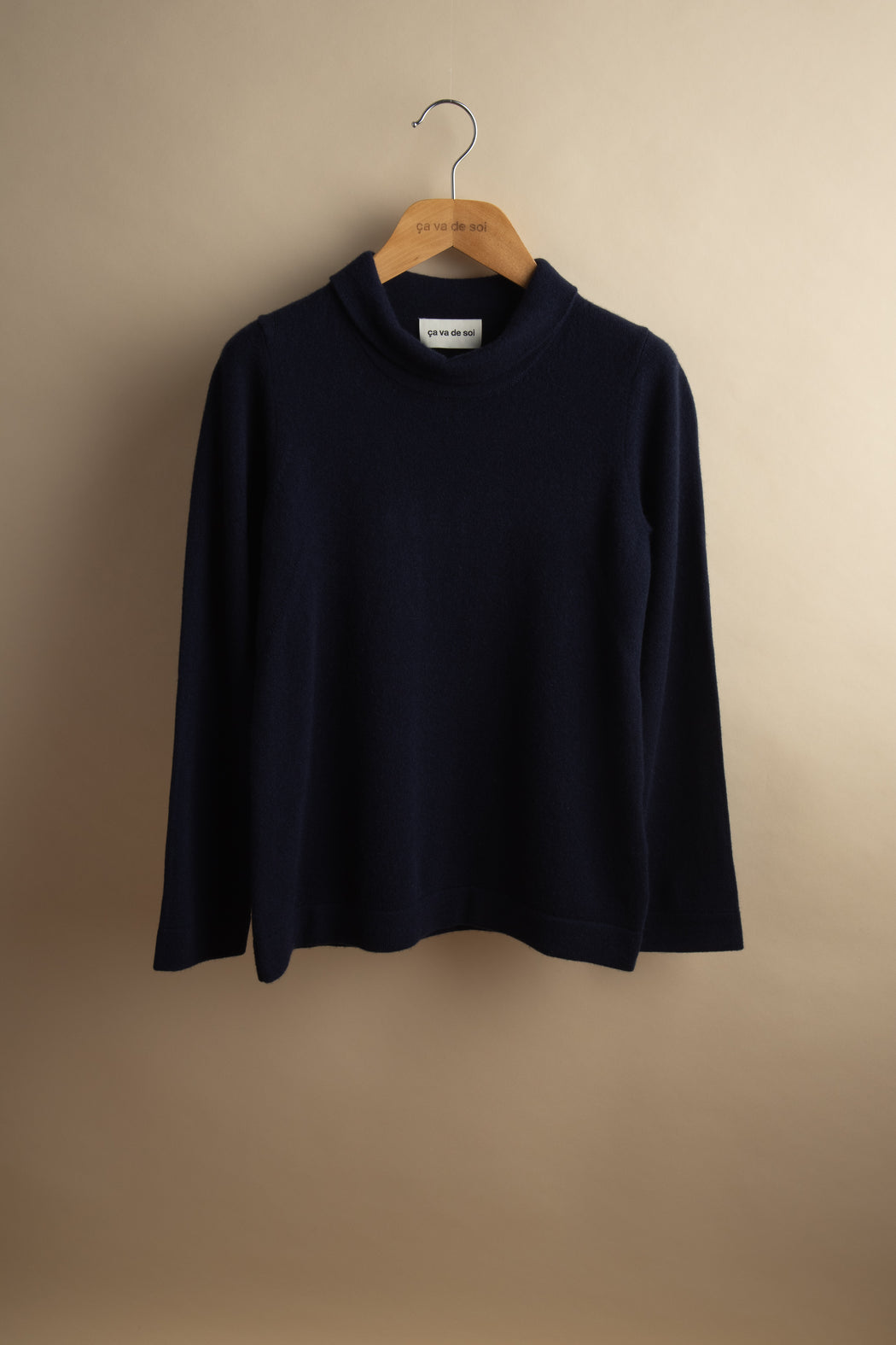 Its shorter, more open neckline than a classic turtleneck folds delicately into a small lapel, subtly framing the face and neck.