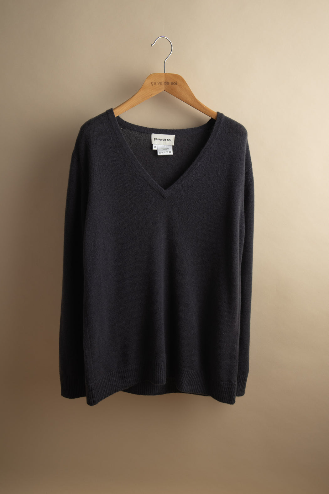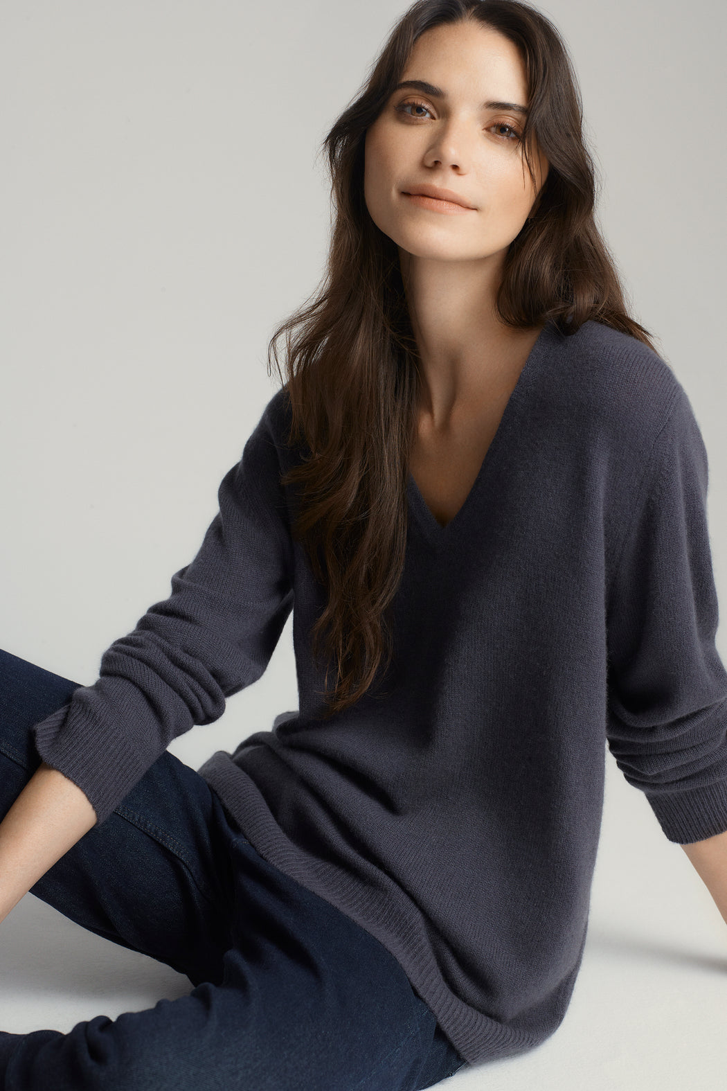 A longish, V-neck sweater with a relaxed style, its fluid drape exudes a natural elegance, a blend of nonchalance and refinement. Its airy jersey knit gives it an almost imperceptible lightness, as if suspended in mid-air. Ribbed trim at the collar and cuffs adds to its suppleness.
