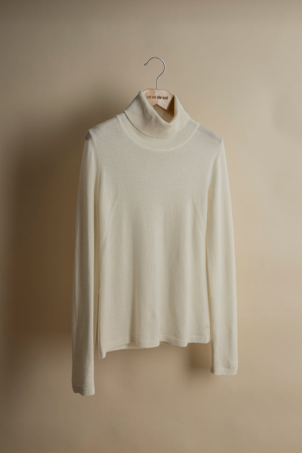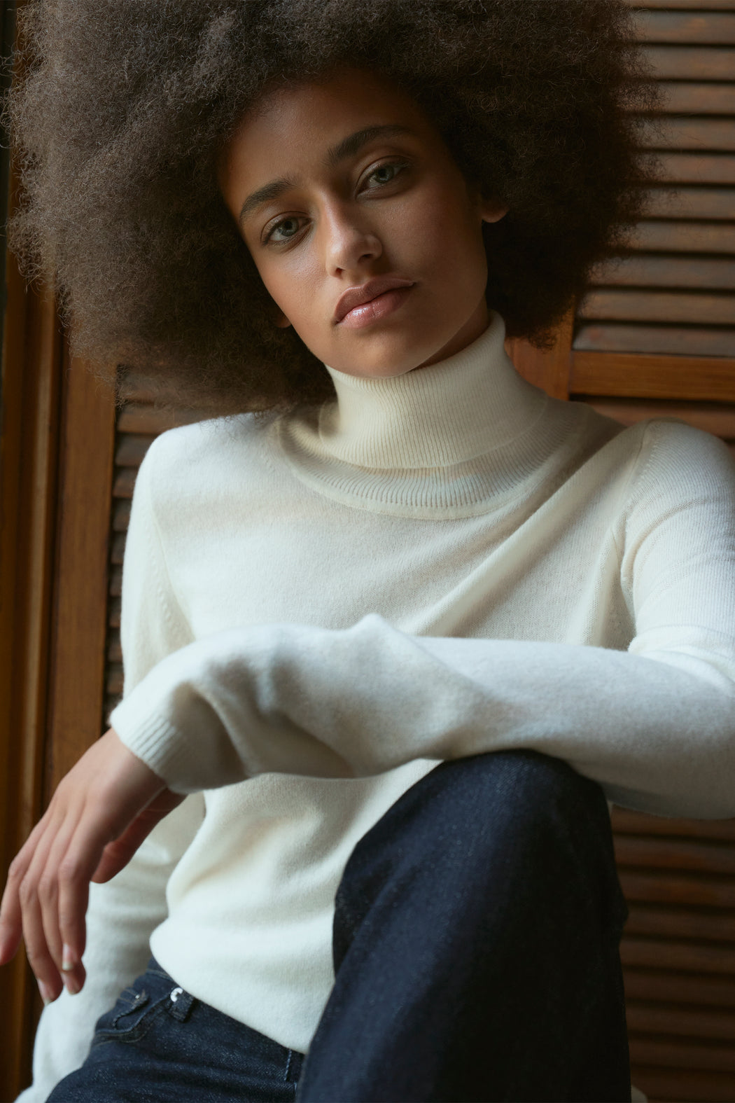Casual elegance guaranteed with this turtleneck sweater. A straight line, a collar that rises to warm up gently, and the refined chic that the discreet chest darts bring, make this model an incomparable piece. It can be worn easily with loose pants in a casual version, near the fireplace, as well as under a suit jacket for long working days.