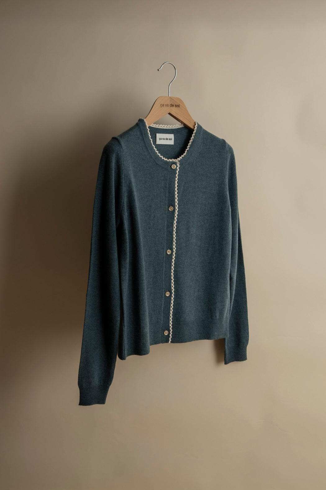 Femininity and sensuality best define this style. The "handmade" crochet lace is a detail here that brings a touch of nostalgia and a touch of craftsmanship: it is a pretty contrast that highlights the border at the neck and along the buttonholes. We love it with simple pants or a pencil skirt such as Hermione, for a twin-set in perfect harmony.