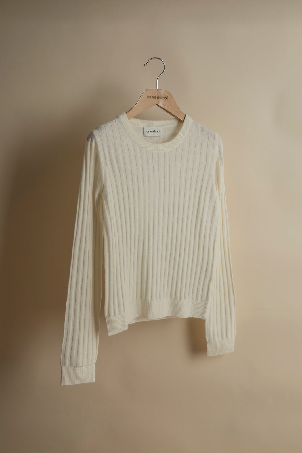 A round-neck sweater, featuring flat ribs that evoke the charm of the sixties and its famous "sock" sweater. It has beautiful, simple proportions and a straight cut that Françoise Hardy would not disown. Its length is just right, very contemporary, while its reinterpreted vintage spirit will add a touch of simplicity and comfort to your outfit. Paired with jeans and low-heeled boots, it’s a major asset for your wardrobe.
