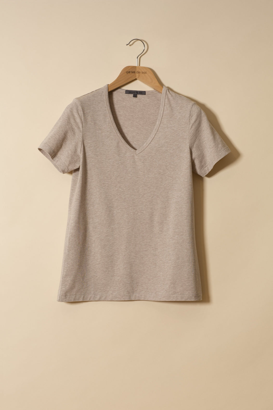 This A-line V-neck t-shirt is made of Egyptian mako cotton COM4-ZÉRO® mixed with 8% Dupont Lycra®. It hugs the body like a second skin, with a hint of stretch that gives the yarn support you’ll adore. To be worn alone or slipped discreetly beneath a cardigan or other tops.