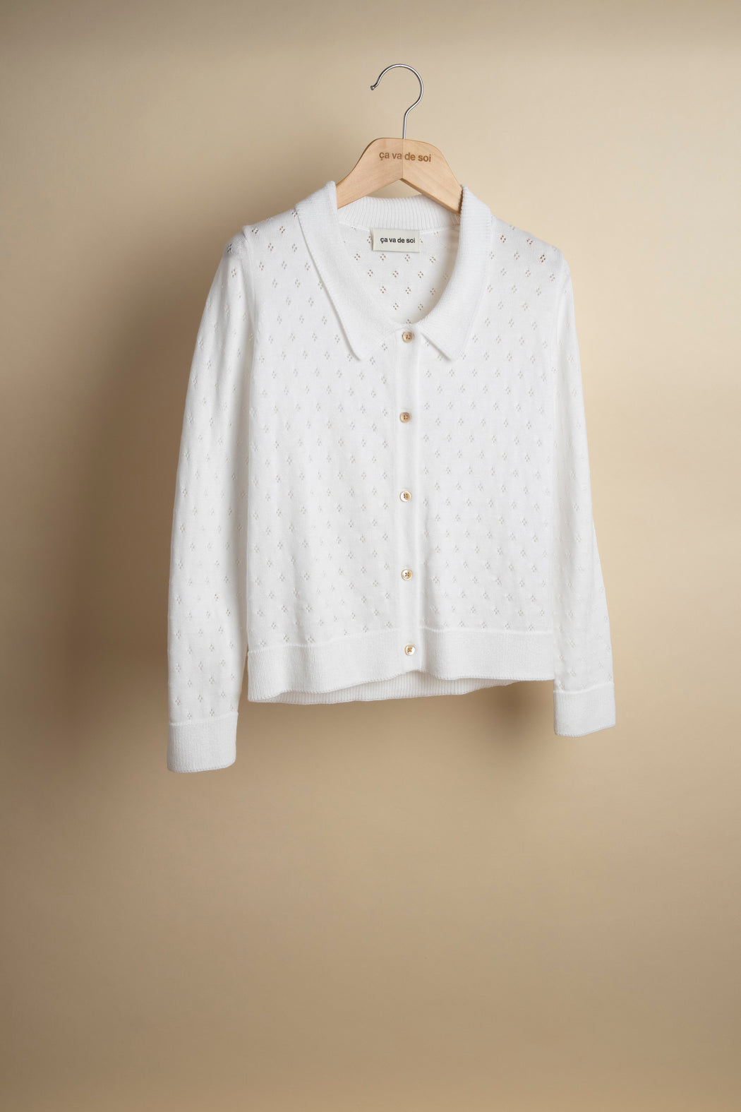 A feminine piece, both in its cut and its decorative detail, the openwork flowers is the ultimate charm… The polo collar and the ribbed finishes give it structure. The tubular buttoning and mother-of-pearl buttons ensure a perfect drape. A piece to be worn on its own, open or closed, with any bottom.. It ensures a singular expression to an outfit.