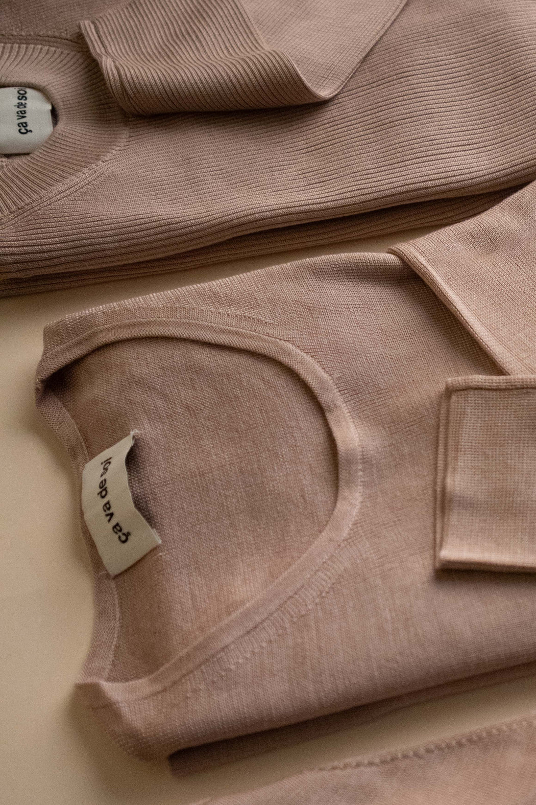 This style is part of a first for ça va de soi: 100% silk ! A silk collection knit in double 120 thread, combining sensuality, intimacy, and comfort. Lightweight and offering an incredibly soft touch, silk keeps you warm in the winter and cool in the summer. The silk protein contains 18 amino acids that help stimulate collagen production in the skin along with possessing hypoallergenic qualities. The silk is produced by the Bombyx silkworm which feeds on mulberry leaves, hence its name «mulberry silk. »