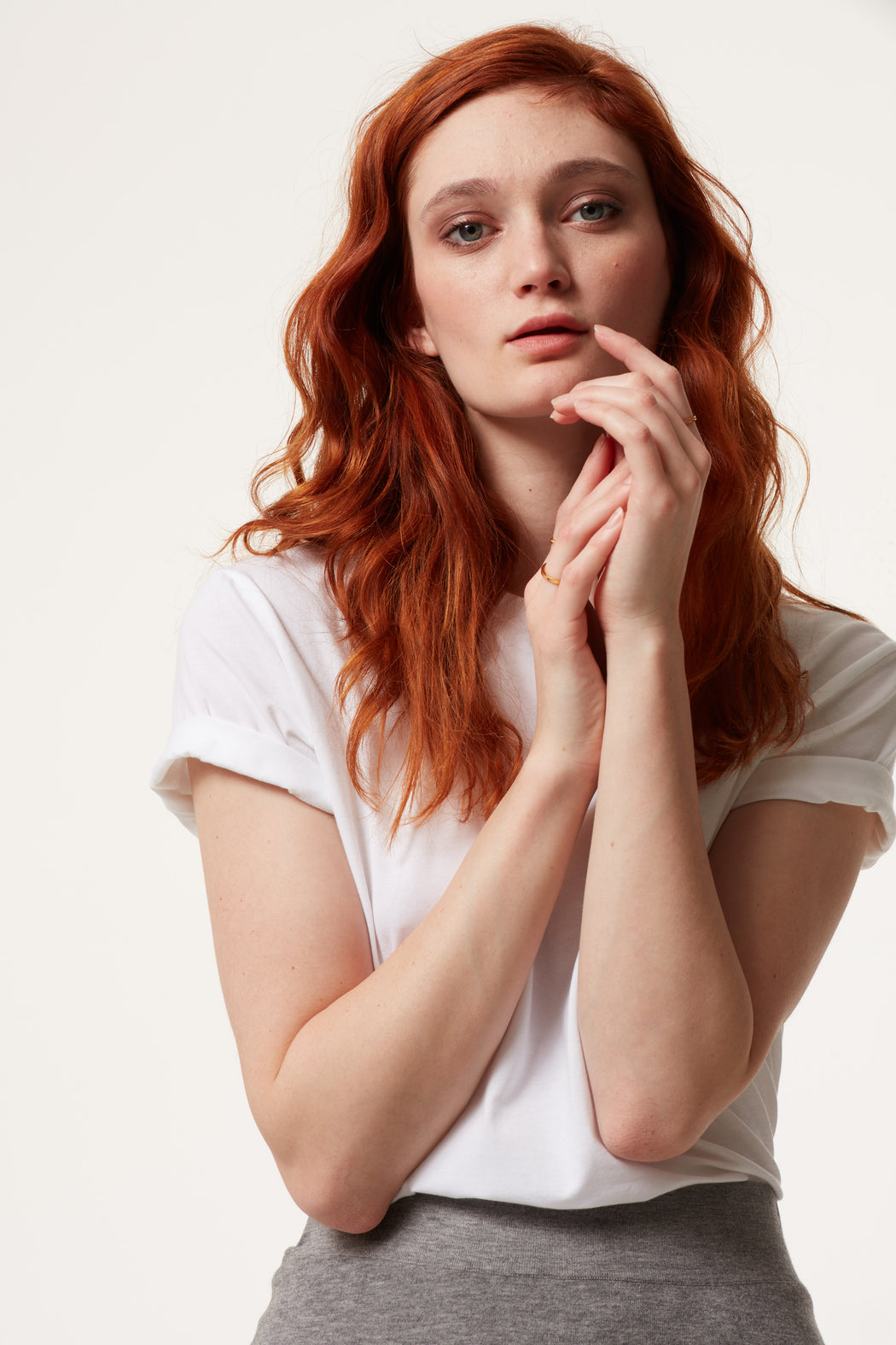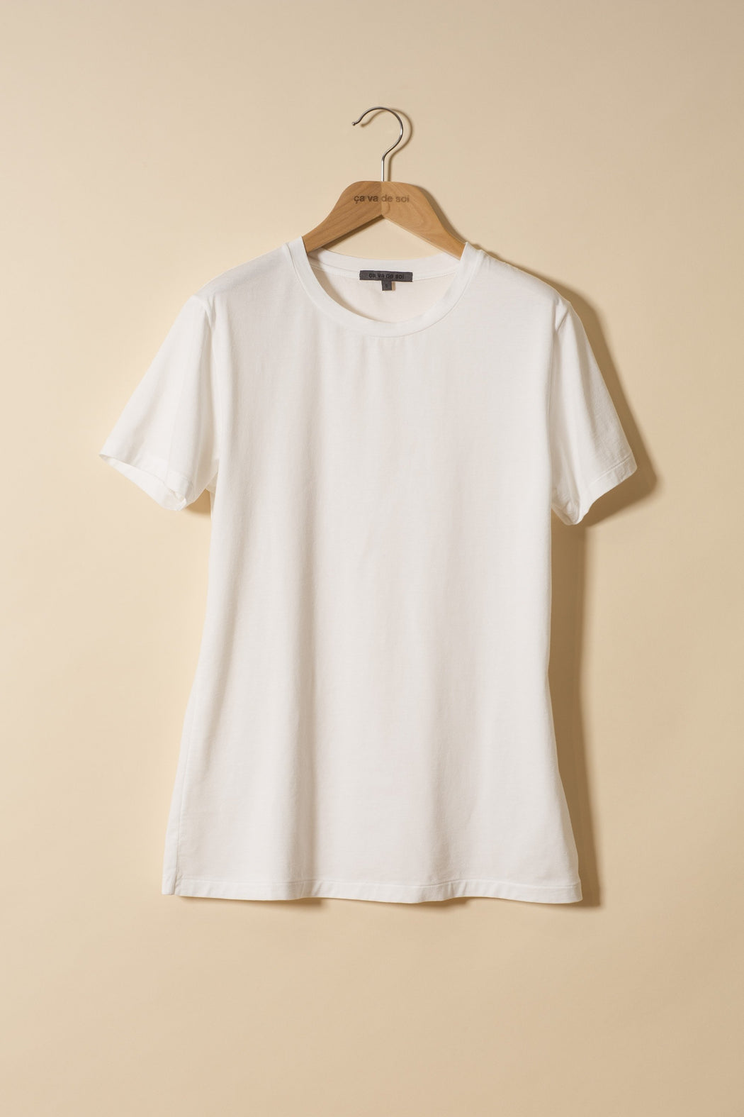 This t-shirt is made of Egyptian mako cotton COM4-ZÉRO® mixed with 8% Dupont Lycra®. It hugs the body like a second skin, with a hint of stretch that gives the yarn support you’ll adore. To be worn alone or slipped discreetly beneath a cardigan or other tops.