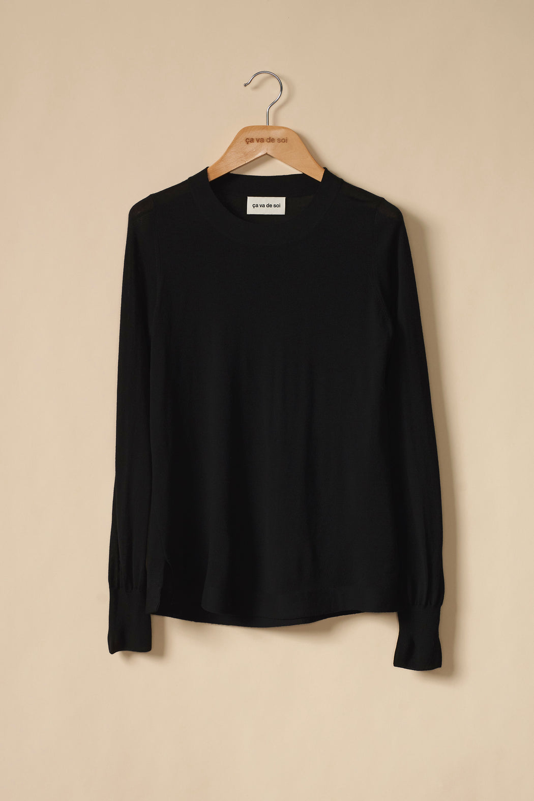 This long sleeve crewneck pullover is made of fine Super 120 extra-long staples merino wool. Transitional and thermal, ça va de soi uses it for its softness, lightness and freshness. The side slits and tubular neck finish details give it a relaxed feel. You will want to take it with you everywhere at all times.