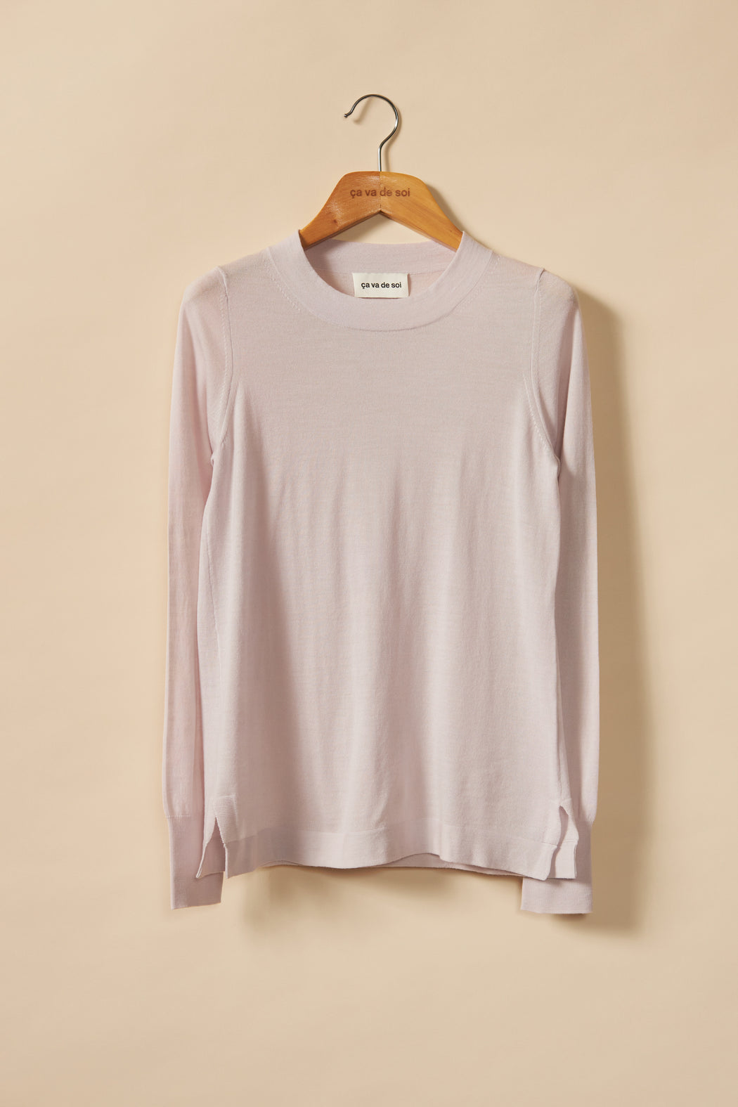 This long sleeve crewneck pullover is made of fine Super 120 extra-long staples merino wool. Transitional and thermal, ça va de soi uses it for its softness, lightness and freshness. The side slits and tubular neck finish details give it a relaxed feel. You will want to take it with you everywhere at all times.