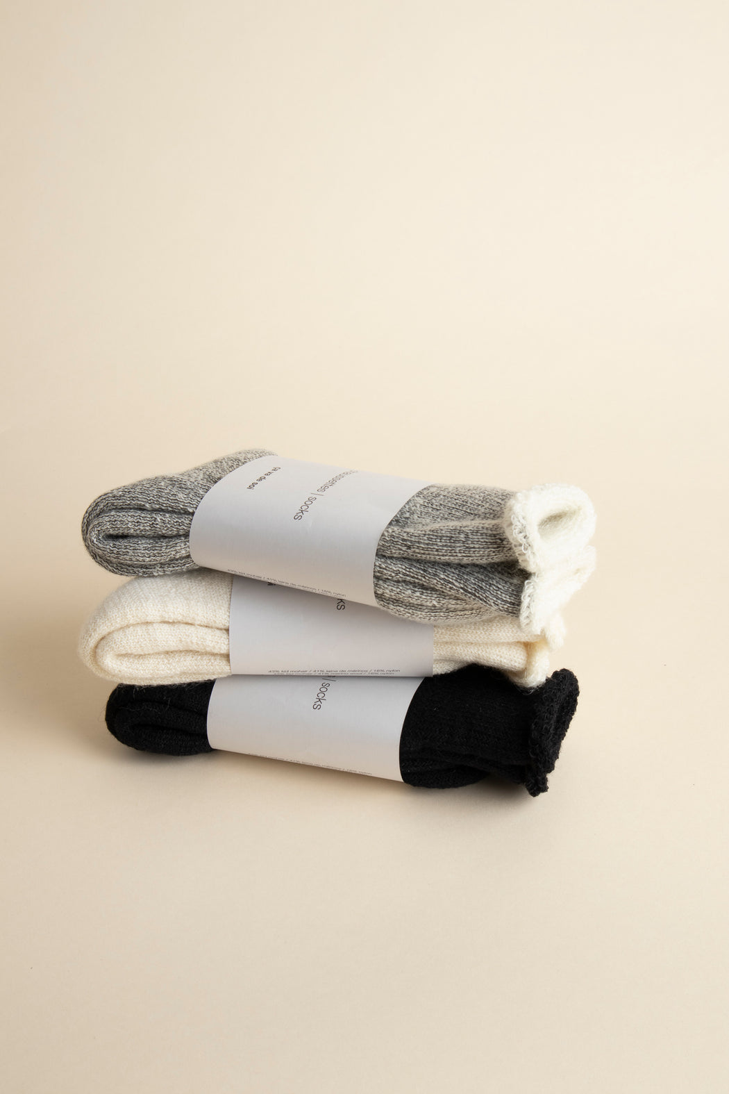 Discover the perfect blend of comfort, warmth, and durability with our kid mohair and merino sock. Similar to our original blend of 70% mohair, the addition of merino wool enhances thermoregulation, retains heat, and maintains moisture-wicking properties while adding volume to the socks.