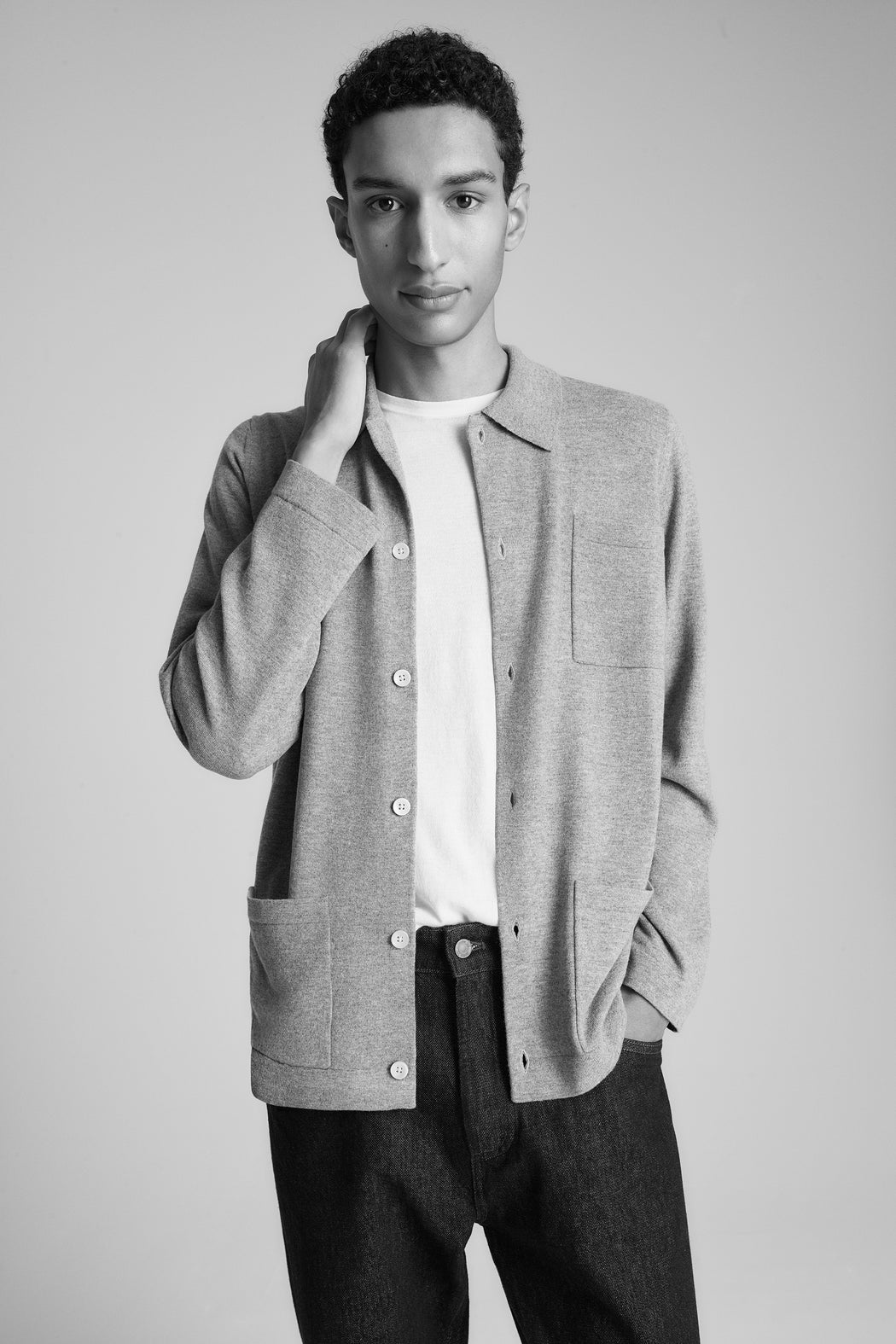 Halfway between an overshirt and a postman’s jacket, this piece carries a very Parisian flair. Practical with its three large patch pockets, its collar adds structure and chic. Tubular jersey finishes ensure a straight, elegant drape. Comfort without sacrificing style.