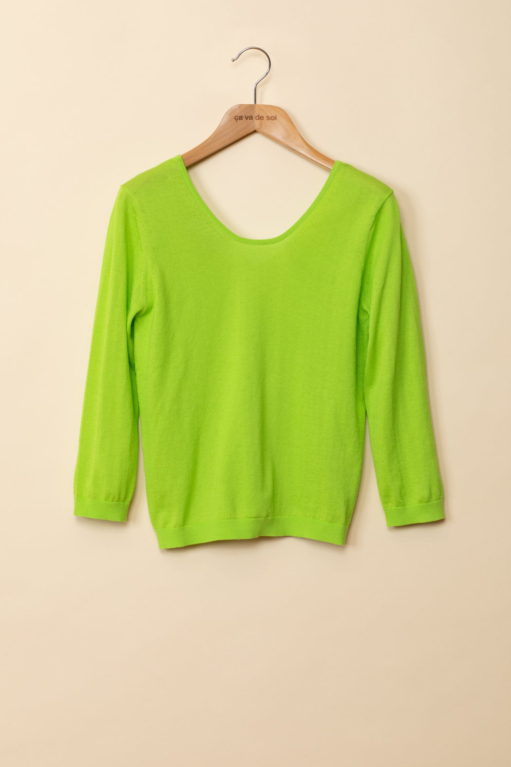 Ballerina sweaters, ça va de soi loves to revisit them every season. This spring, Veronica’s edge comes in a splash colour and the refinement of its neckline details. Made of Egyptian cotton COM4-ZERO™, the fruit of 50 years of research, this Italian thread combines the age-old beauty of Egyptian cottons with a cutting-edge spinning technique that eliminates fuzziness, which traditionally causes pilling over time. We produced this knit in 4 rich hues (hank dyed by Italian masters): pineapple, pistachio, guava, black.