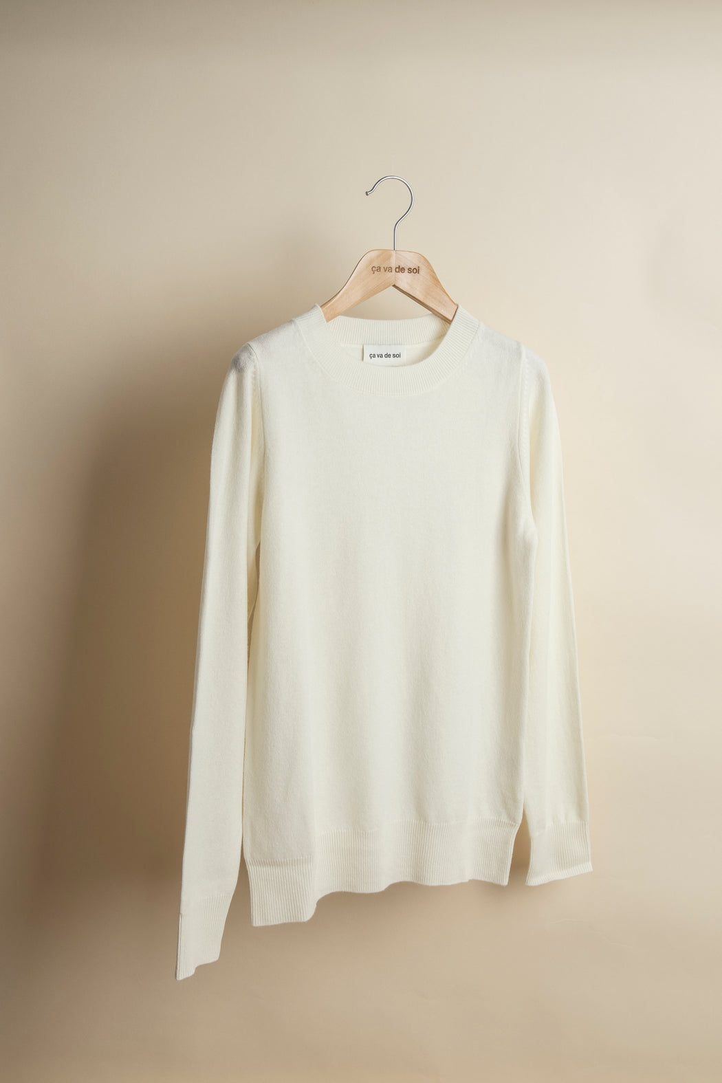 Knitted in carded merino wool, spun expressly in Italy for ça va de soi, whose extrafine (15.5-micron) and ultra-long fibre (a guarantee of longevity and beauty) gives the impression of wearing a cozy cloud — an emotional and intelligent material that understands one’s body language.