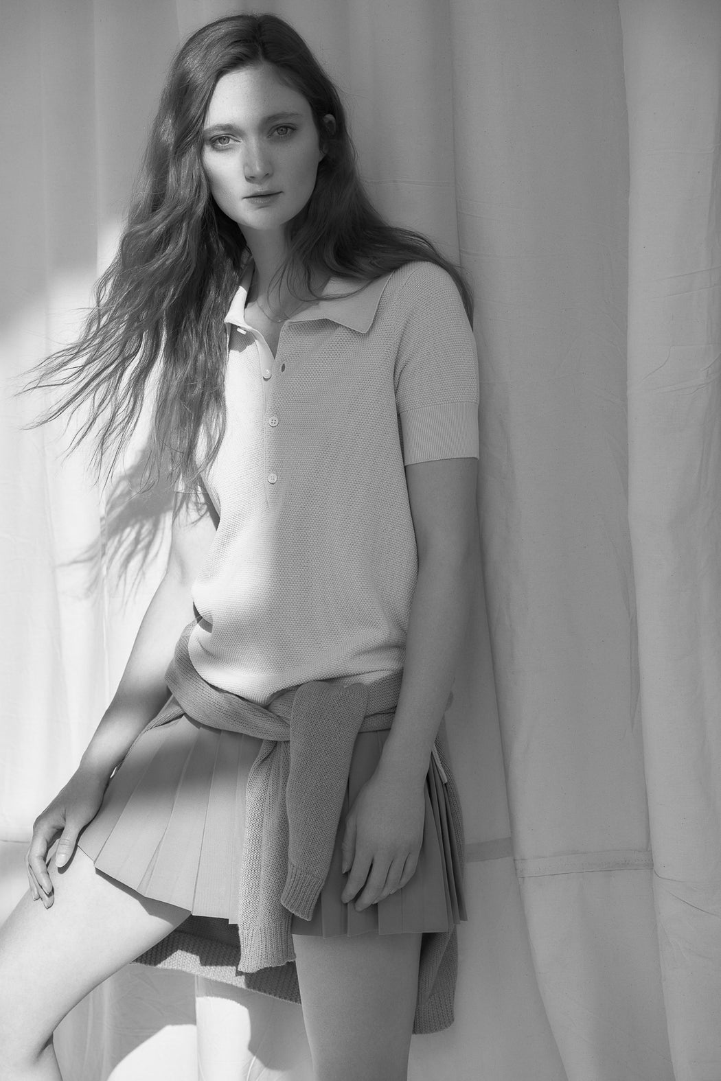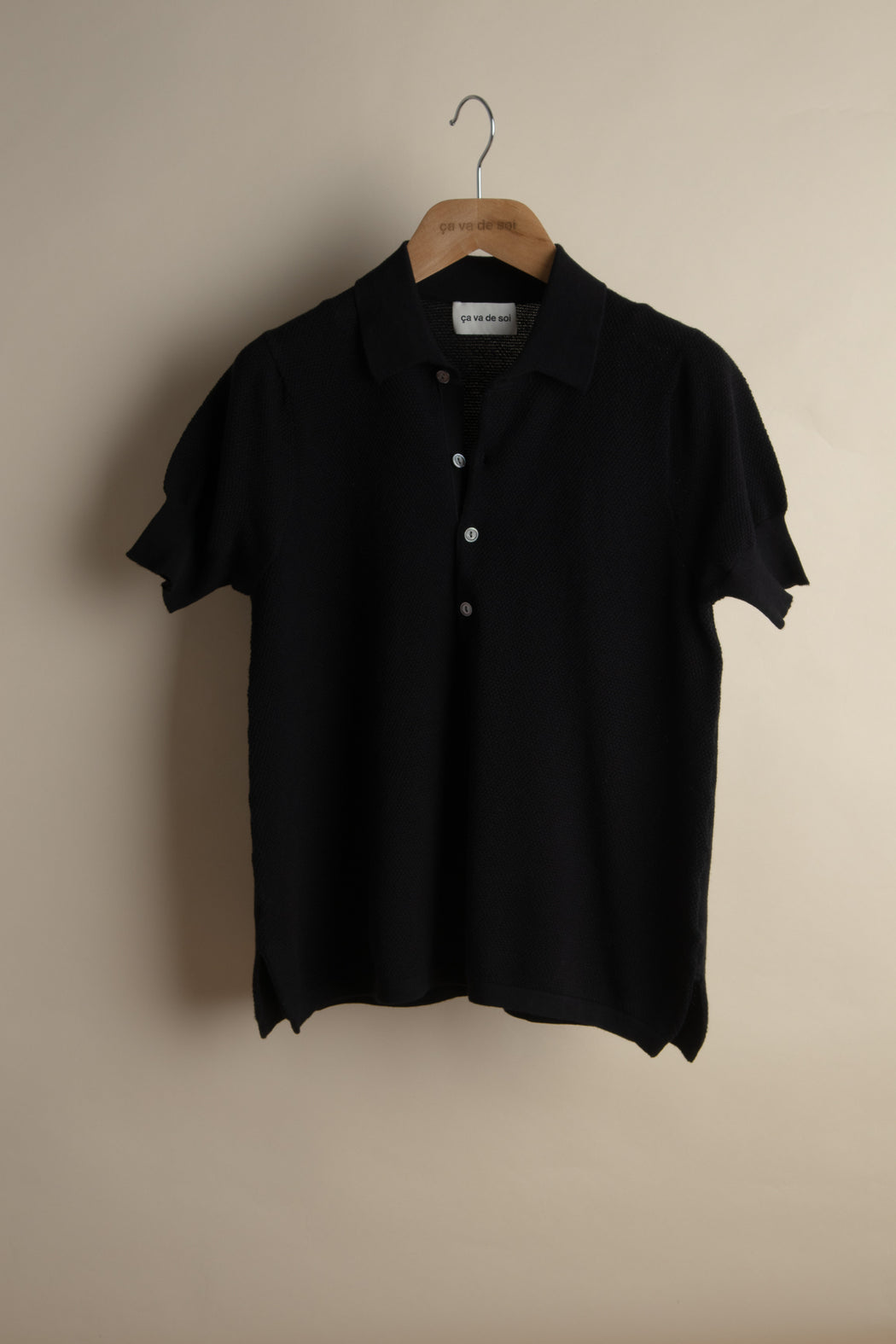 The texture in traditional “pique” knitting gives this polo an elegant sportswear look. Meanwhile, its small puff sleeve, side slits, and elongated button placket give it a subtle touch of femininity that we love.