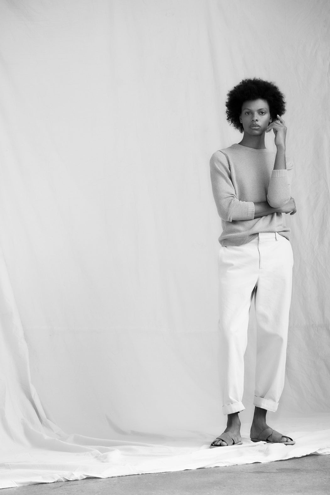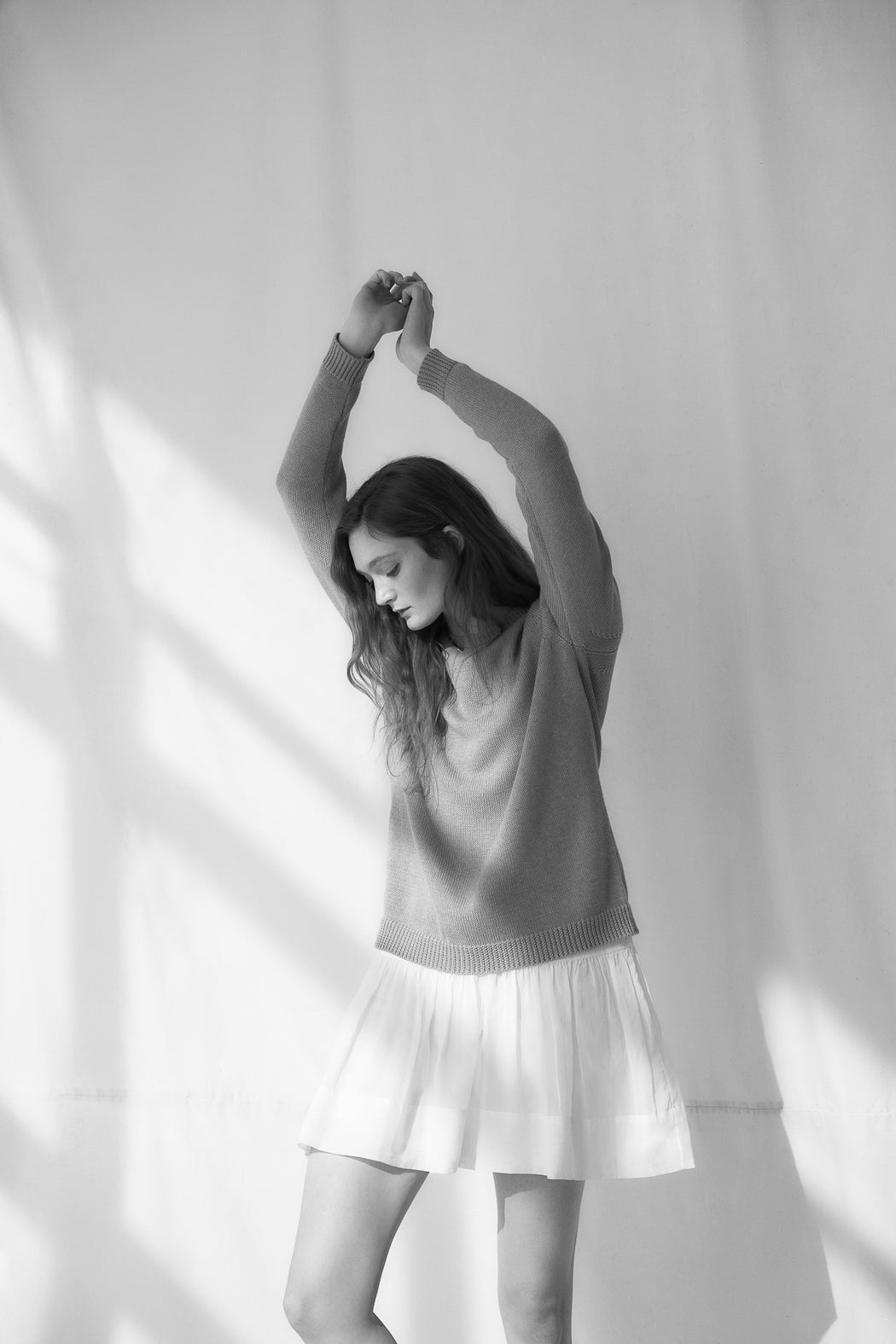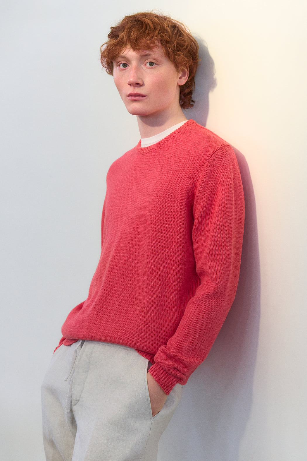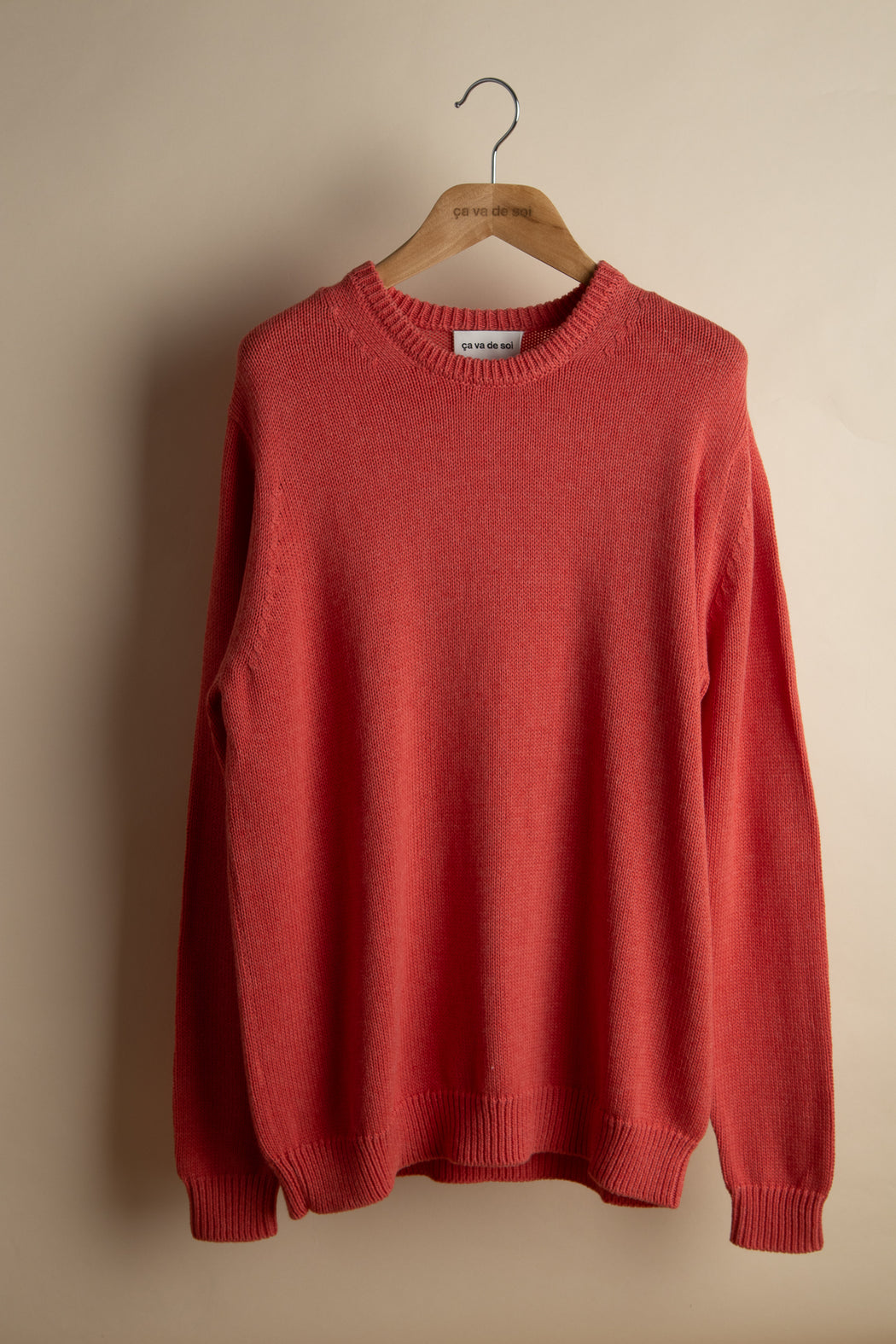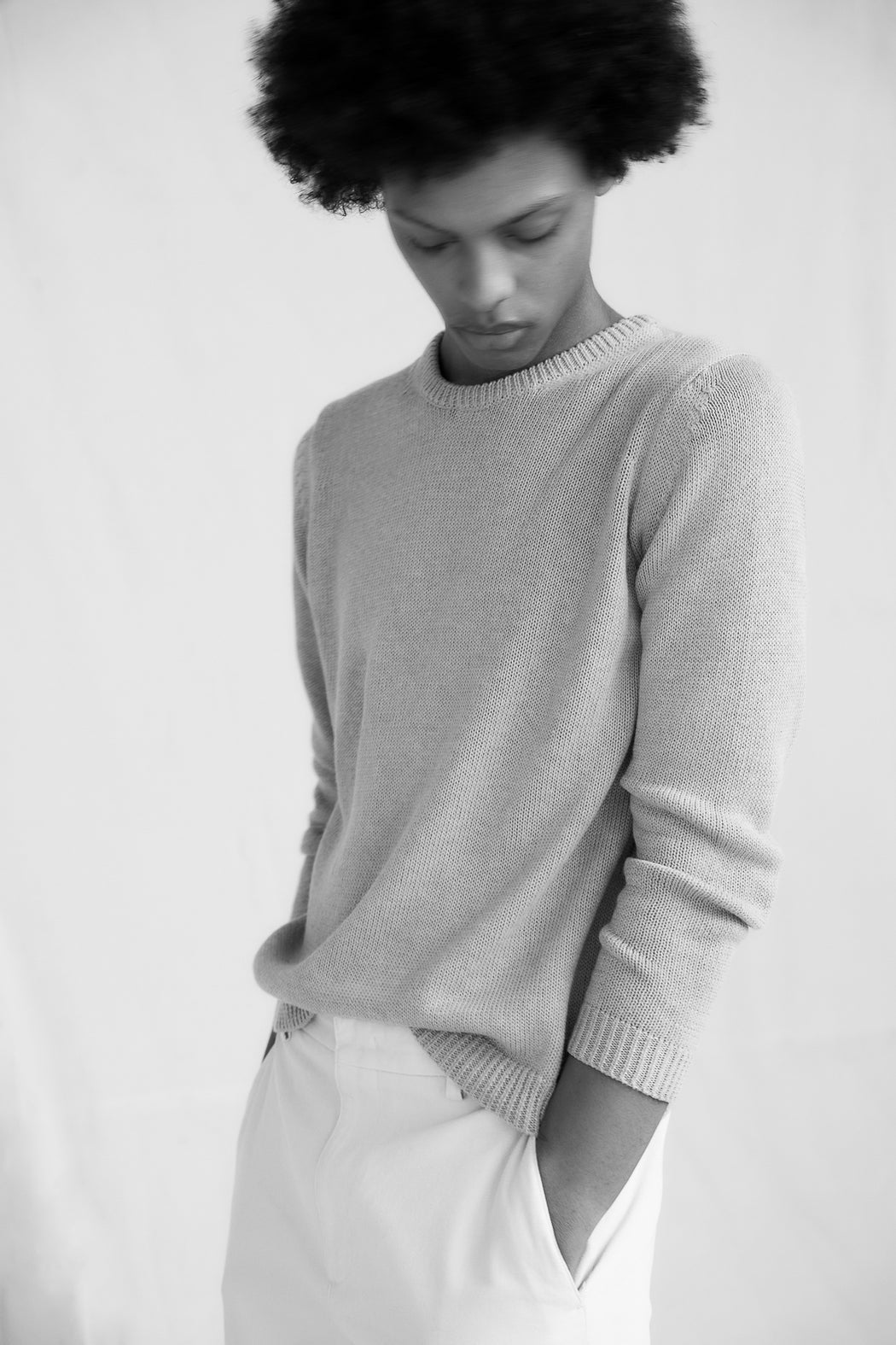Its loose knitting in 7 gauge brings a real sense of lightness while remaining cozy... Unisex and classic, both in its details and silhouette, its very slightly scooped neckline offers a relaxed look. We particularly love the detail of the needle reductions at the armhole, as well as the ribs on the sleeves and bottom.