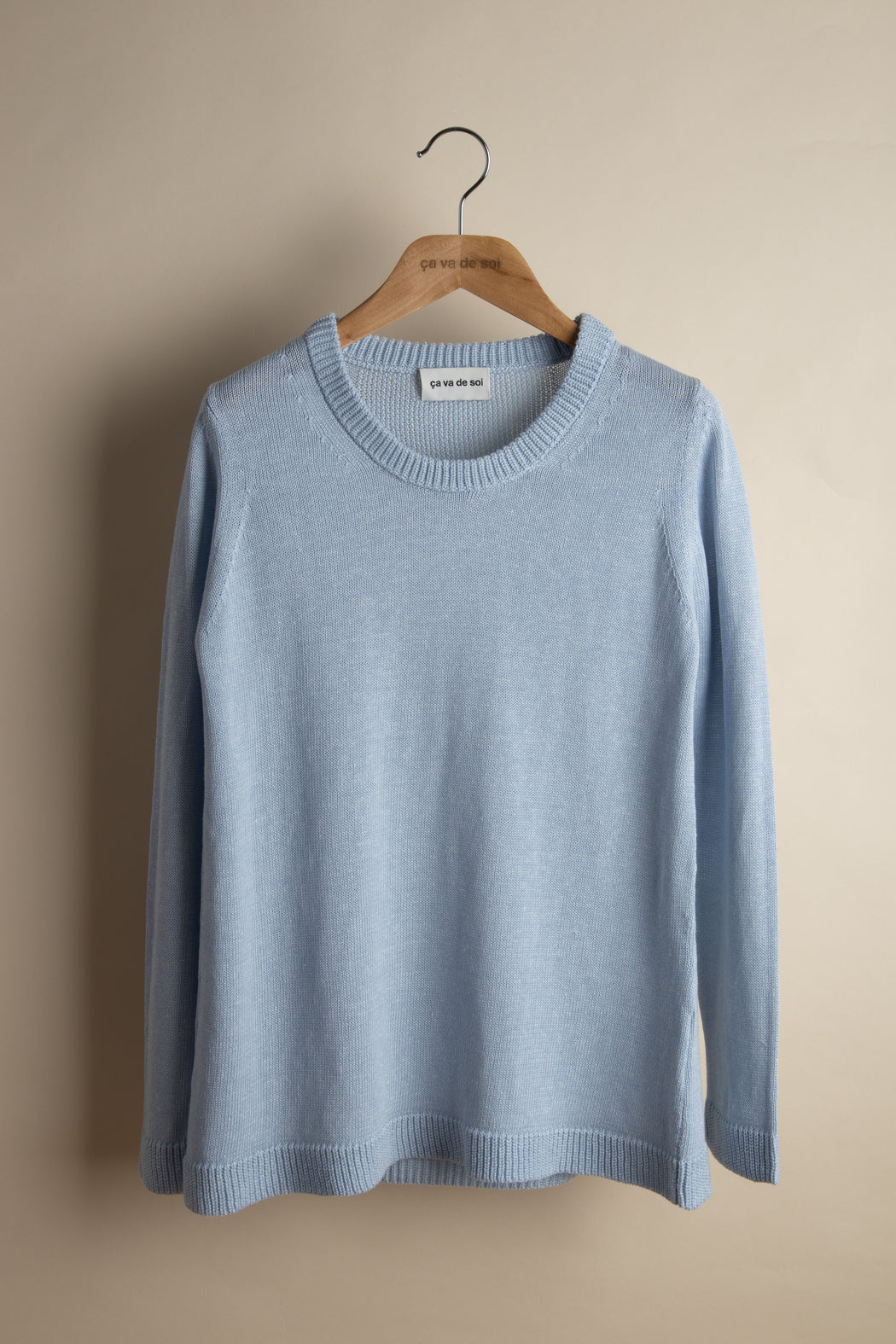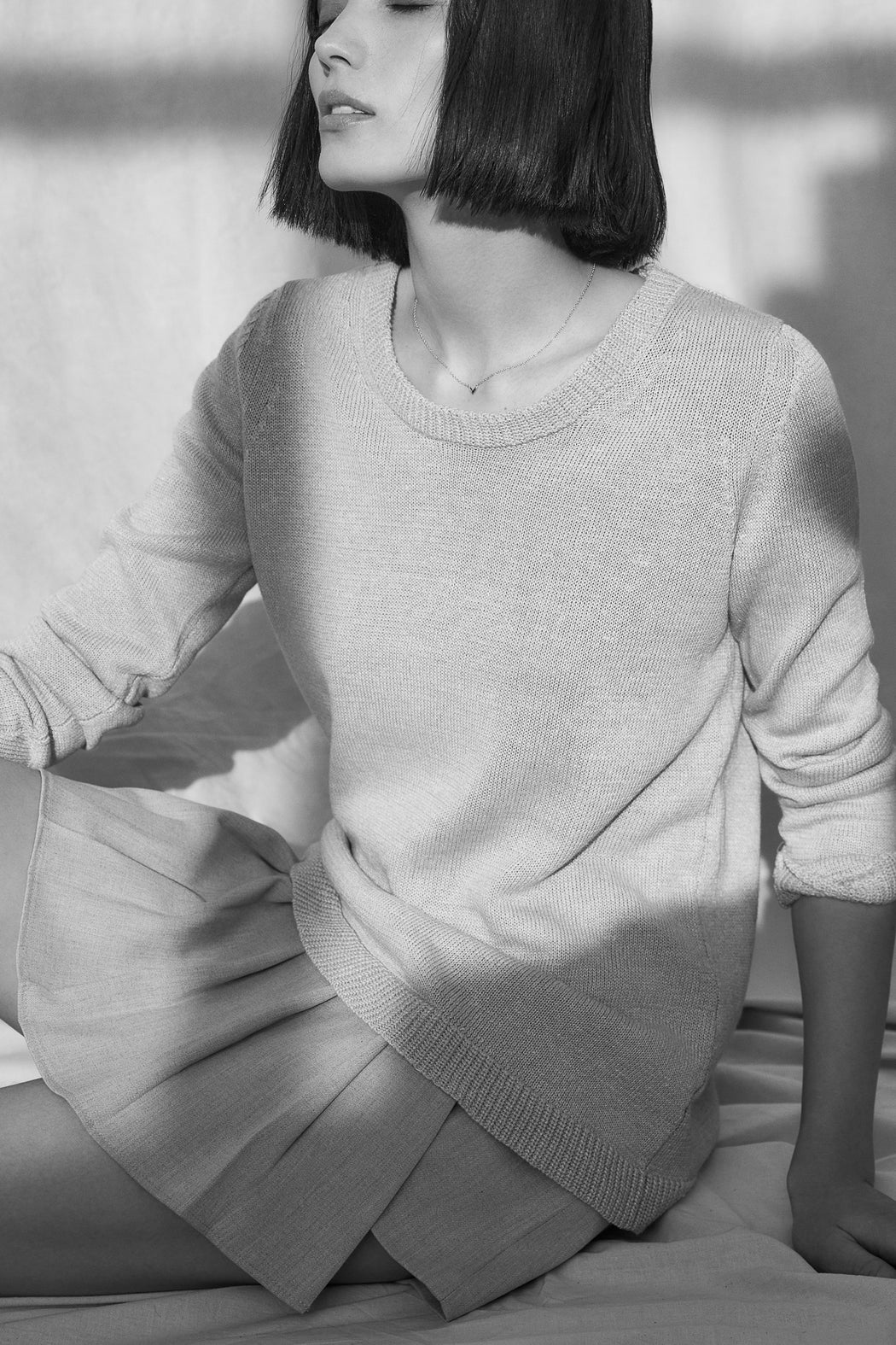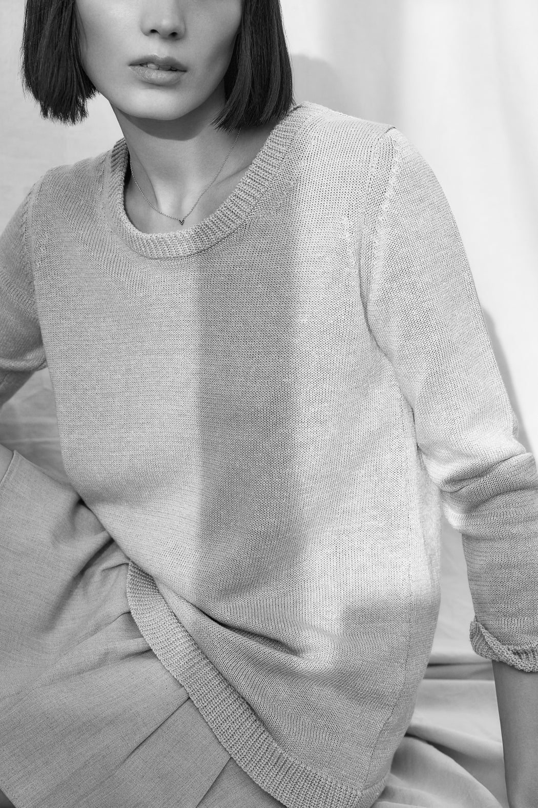 This slightly A-line sweater has meticulous details: a jewel neckline that subtly highlights the neck. A moss stitch knit detail in the back, and a beautiful texture that make it decidedly feminine. The ribbed edges on the sleeves and collar give it a 'handmade' charm.