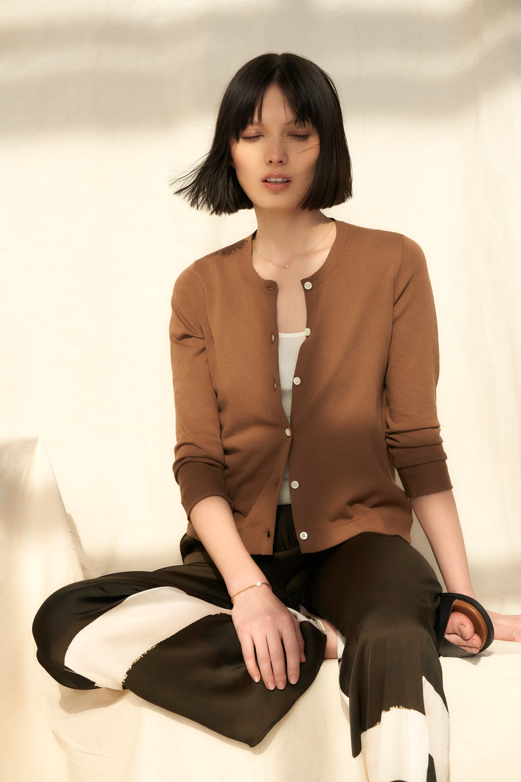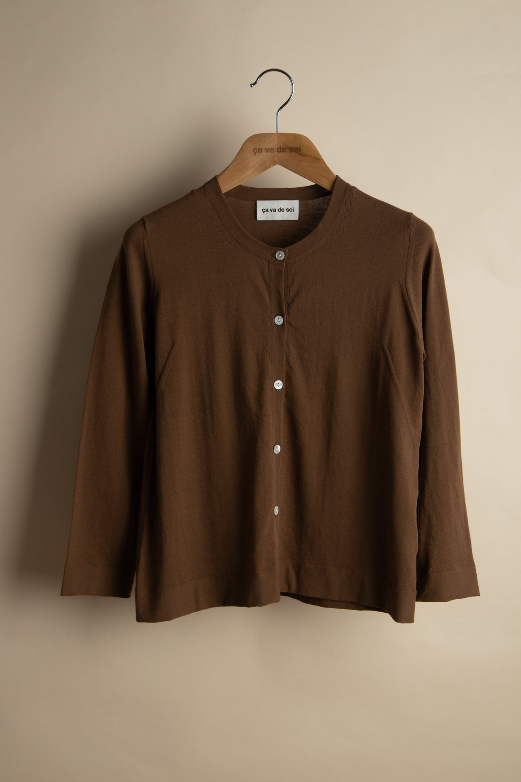 The round-neck cardigan at ça va de soi, we've played it in all its forms... We see it as our 'Kelly'... Modernized here in the detail of the tubular finish of the collar, similar to that applied to woven fabrics, which brings a modern, streamlined, and versatile appeal. Its mid-hip length will adapt to the lower rise of your skirts and pants. It’s all about the play in the buttoning or unbuttoning!