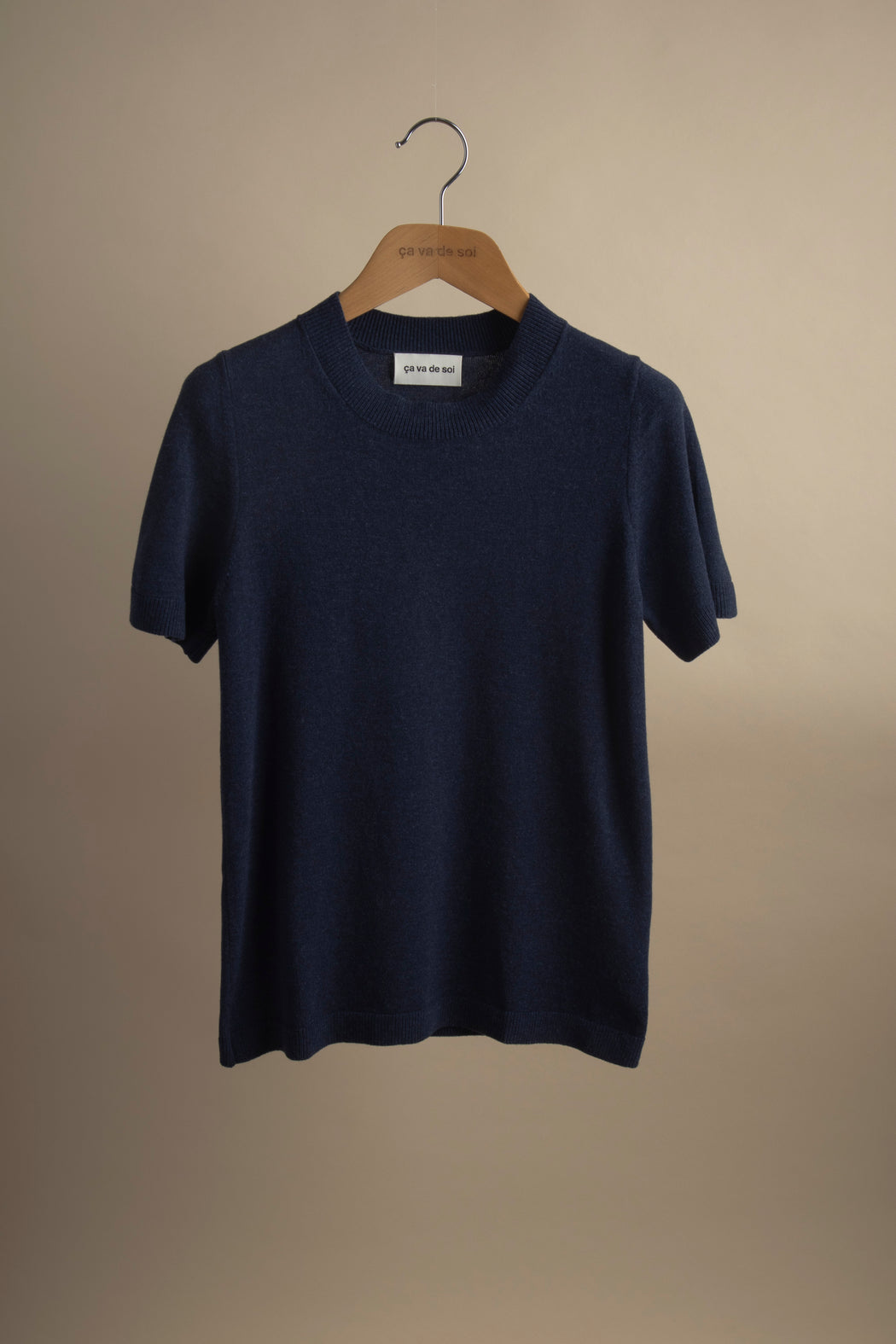 A sophisticated version of the simple T-shirt. Agatha is inspired by the 1940s, it brings a nostalgic touch with its fine 1x1 ribs edging the neckline, sleeves, and hem. It can be worn on its own, styled chicly under a blazer, or as a twin-set with the CORNELIA cardigan.
