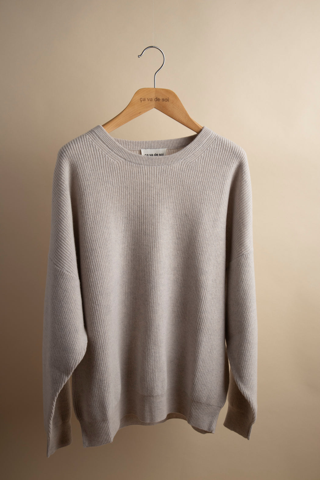 Knitted in carded merino wool, spun expressly in Italy for ça va de soi, whose extrafine (15.5-micron) and ultra-long fibre (a guarantee of longevity and beauty) gives the impression of wearing a cozy cloud — an emotional and intelligent material that understands one’s body language.