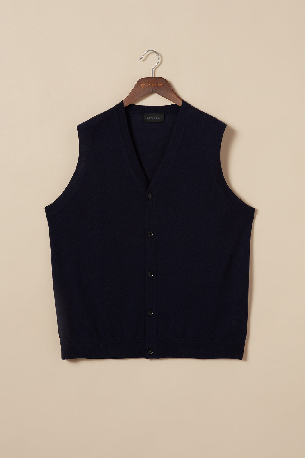 If there’s a masculine classic out there that defies time, it is this sleeveless jacket with smooth tubular knitting, inspired by the 1970s icons. Modernized and embellished with five curved natural horn buttons, this extra-fine merino knit is available in two subtly complex, rich heathered shades - Camel and Anthracite. It also comes in our Absolute black and Sapphire.