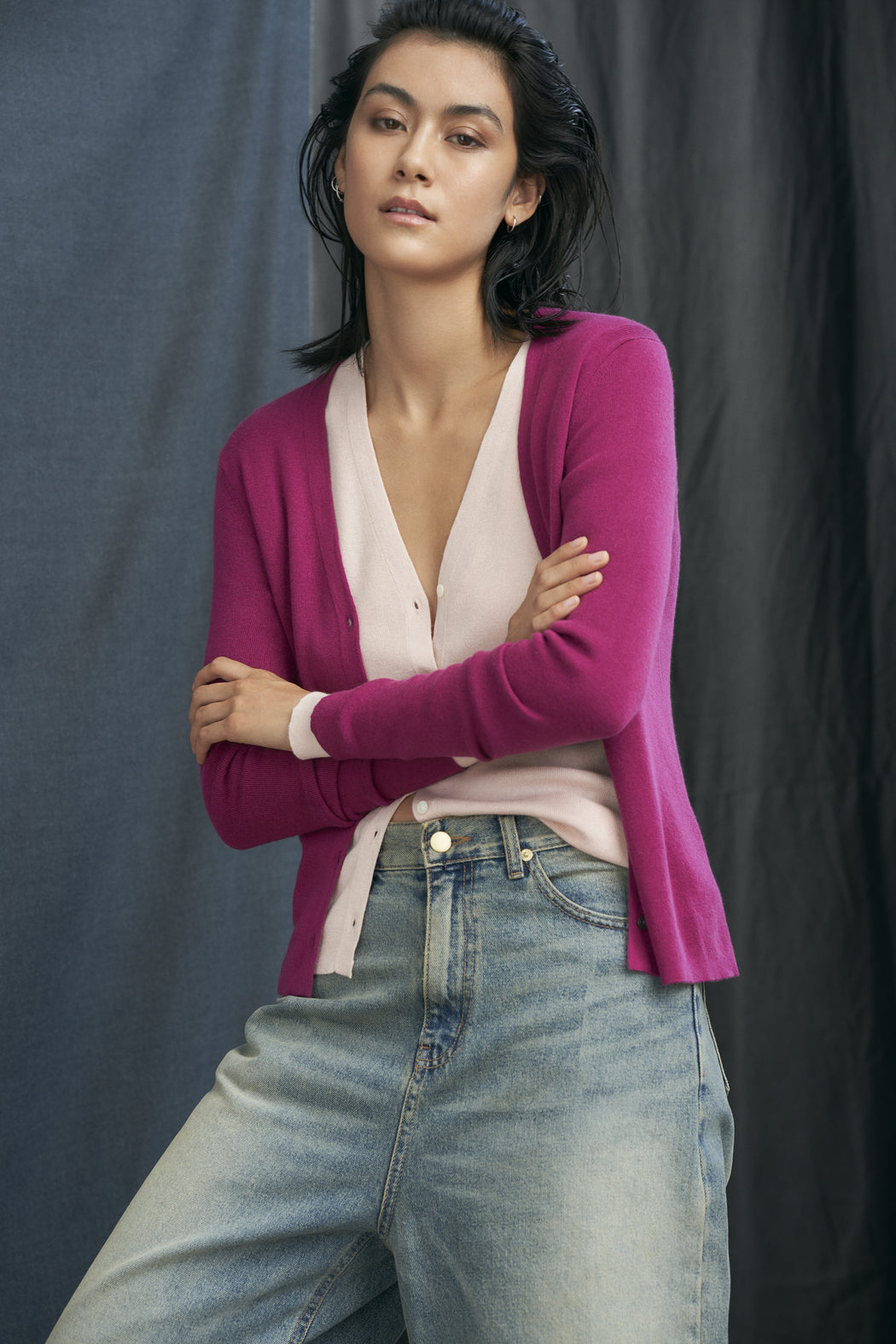 Its pure and modern lines give it a timeless look that will follow you everywhere, with an added dose of femininity thanks to its V-neck and slightly fitted cut. Creates an elegant, refined twin-set when worn with the tank top KIYO. The assemblage of these three exceptional fibres provides a thermal effect thanks to the role of each of them, creating a balance between the retention and the procurement of heat. Silk playing the role of connector and gatherer equivalent to copper in electricity.