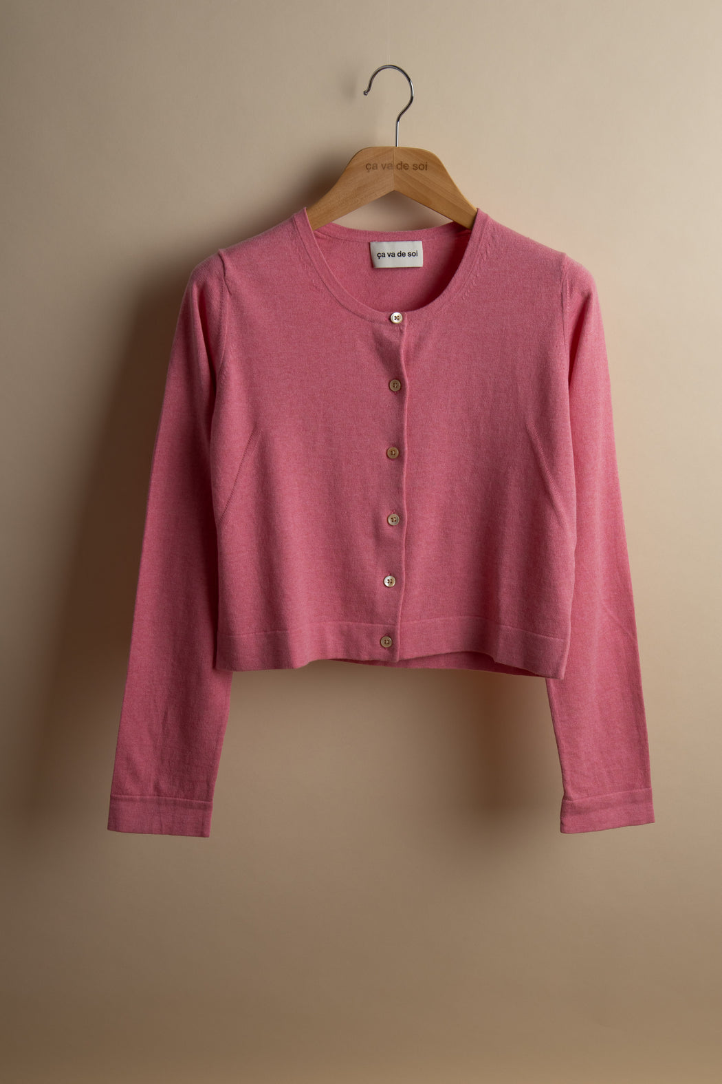 A cropped cardigan with a tubular-knitted trim at the neckline, cuffs, and hem, it drapes gracefully creating a refined look. Mother-of-pearl buttons and discreet darts at the bust are hallmarks of this icon of 1950s elegance. It pairs beautifully with a pencil skirt or high-waisted trousers, as a recall to Grace Kelly herself. Batignolles can be worn on its own or paired as a twin-set with ORSAY, our matching tank top. It also layers beautifully over a sleeveless dress like the COMETE.