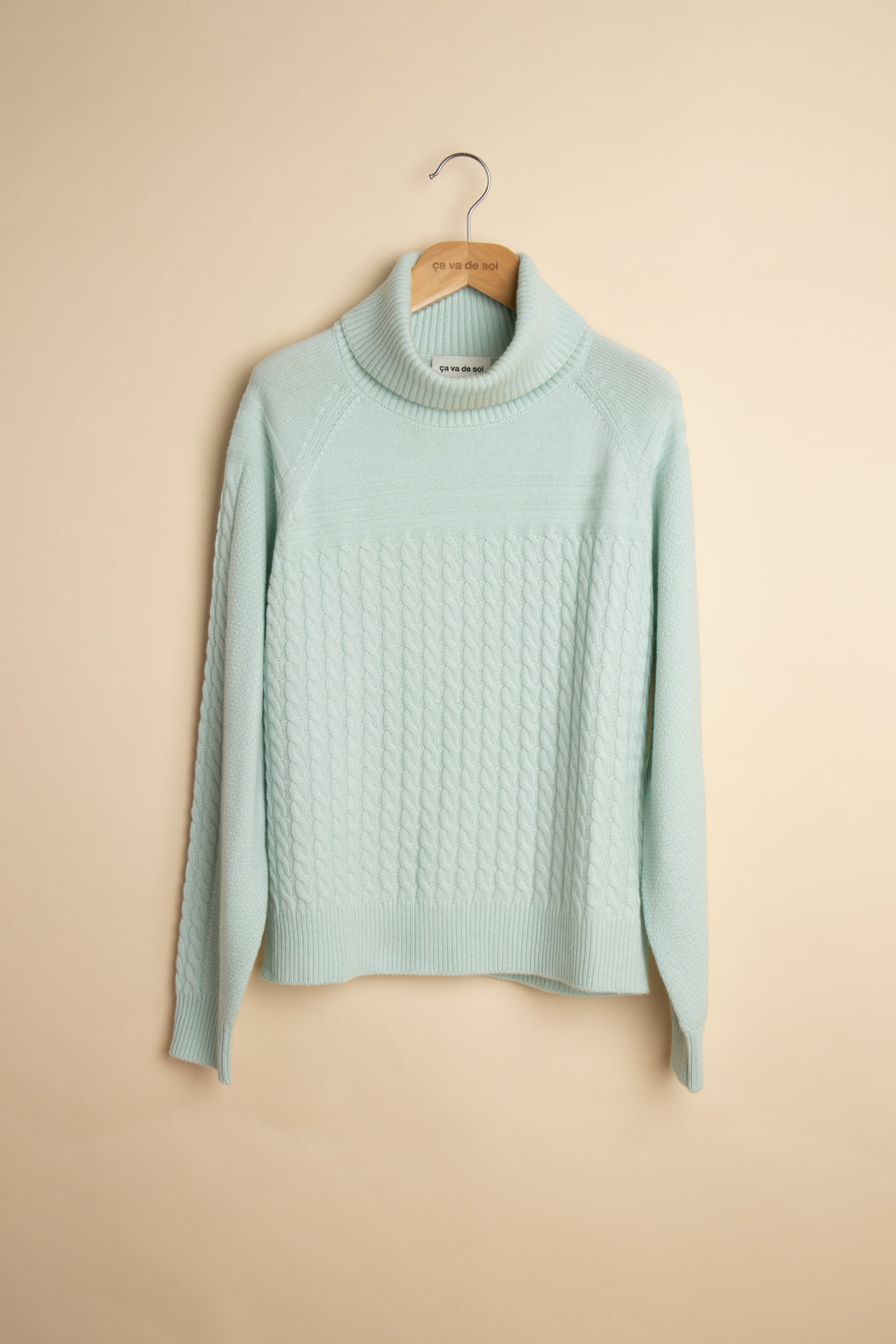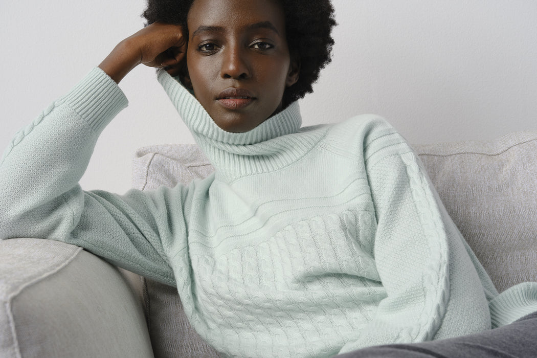 Simultaneously nostalgic, feminine, practical and fun. This effortless turtleneck will bring you warmth and comfort all winter long. The details and textures are inspired by the great classic sweaters worn in ski resorts.