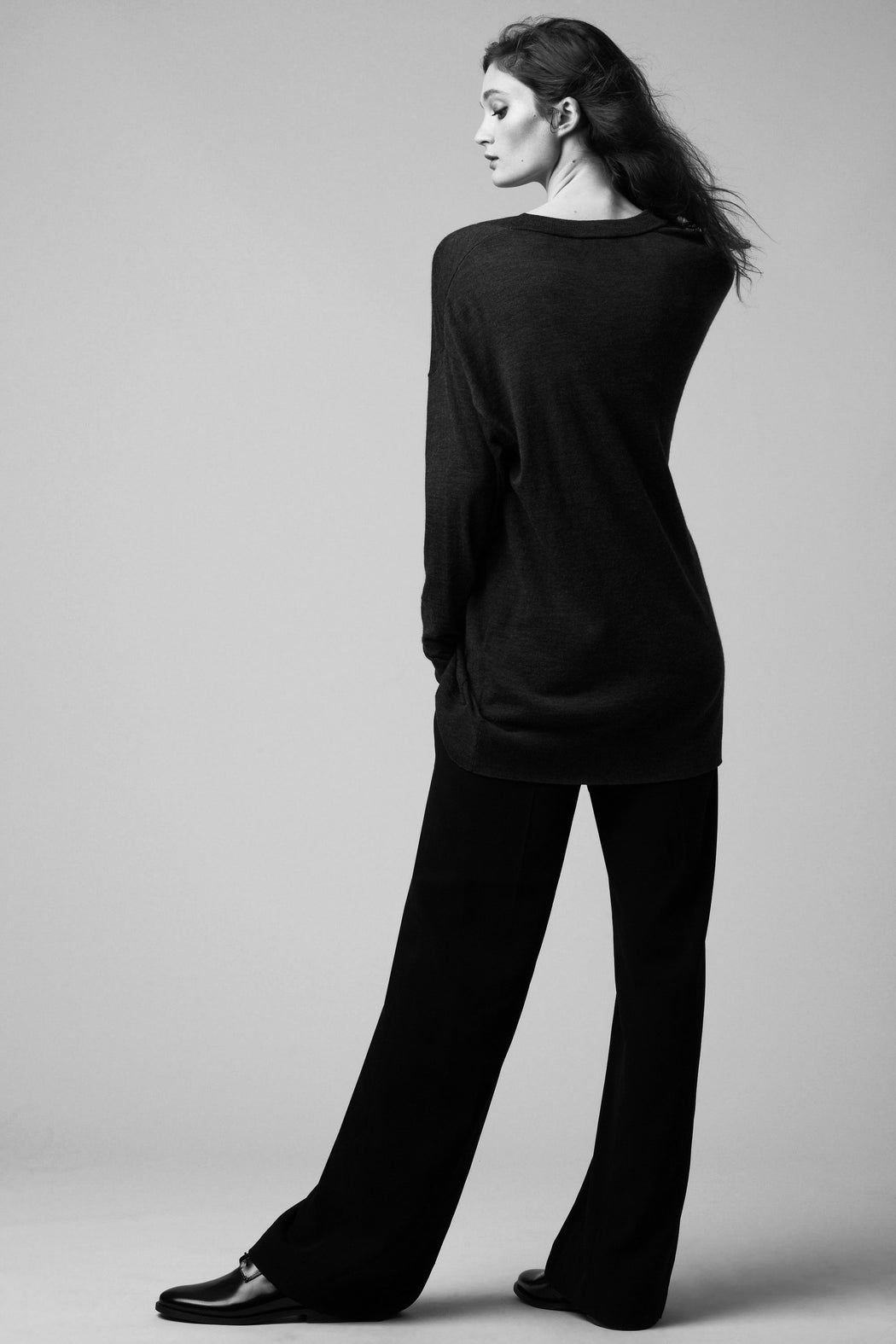 Japanese fashion inspired the creation of this long, loose, V-neck jacket with its rib panels and embellished by five mother-of-pearl buttons. Made with 100% extra-fine merino wool, this knit with pockets is soft, cool and lightweight. This transitional piece comes in black and three colours: brown (Beaver), anthracite (otter) and a warm oat (Lynx). Comprised of a vast spectrum of subtle nuances, these heathered shades are rich and sophisticated.